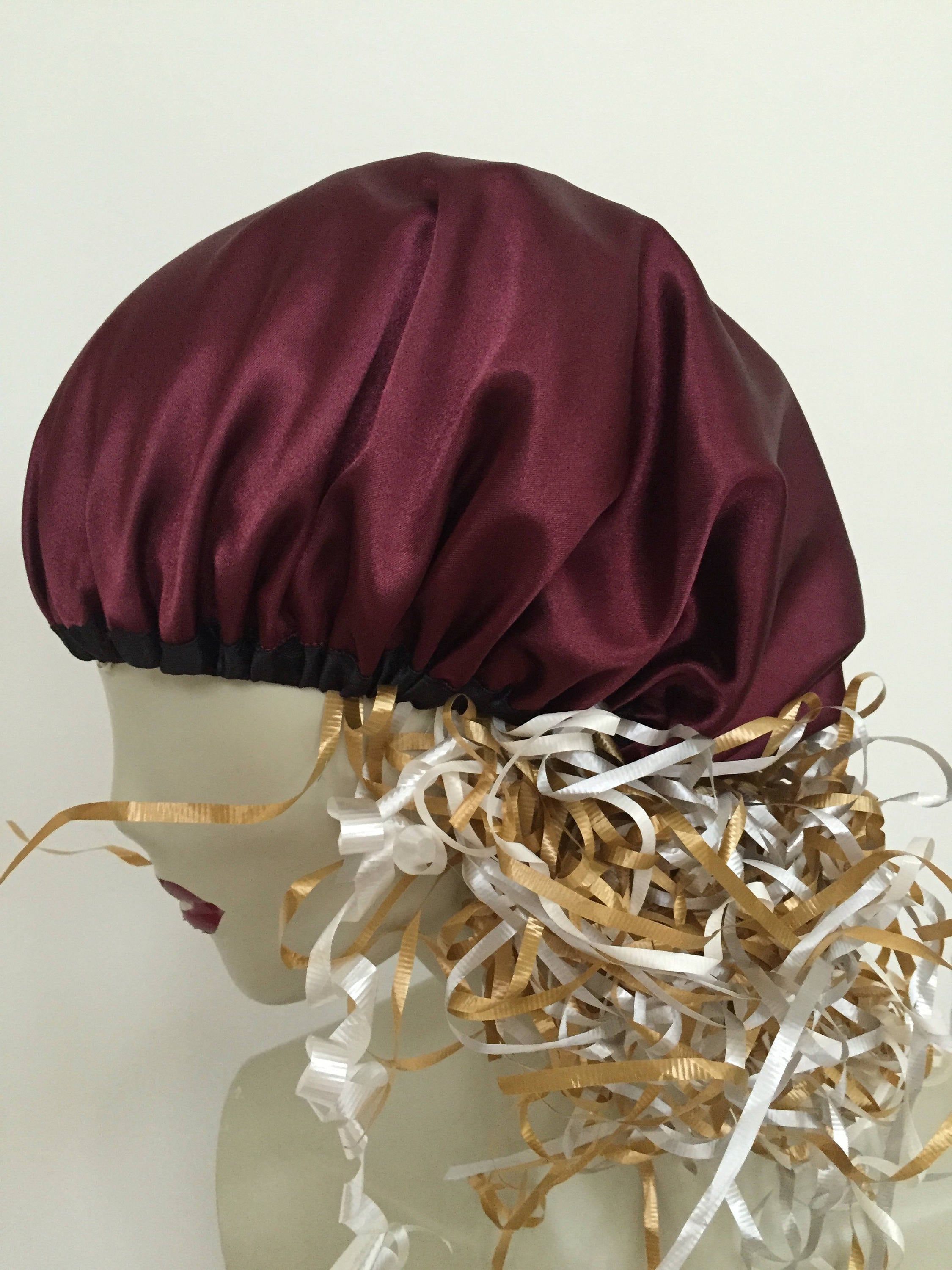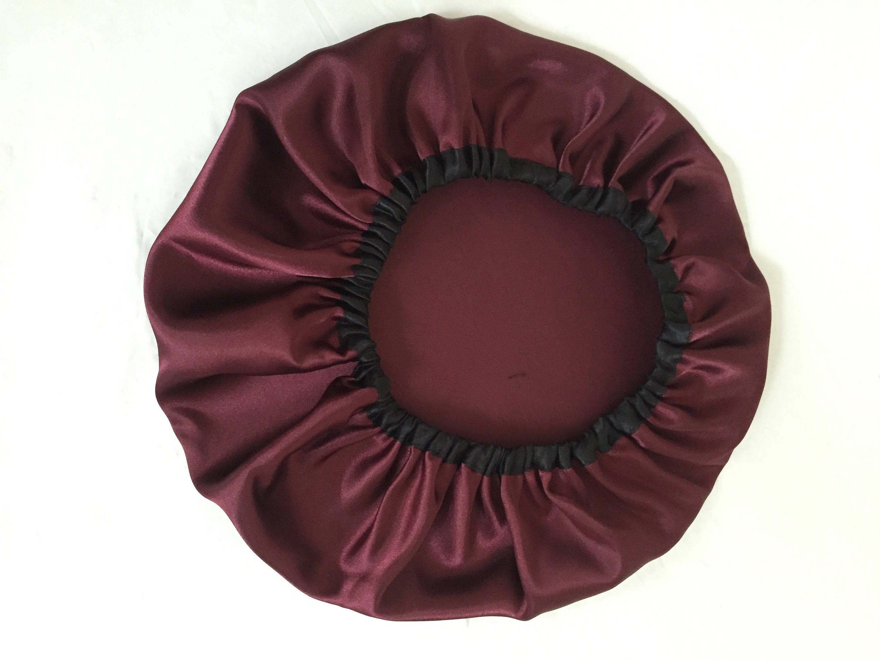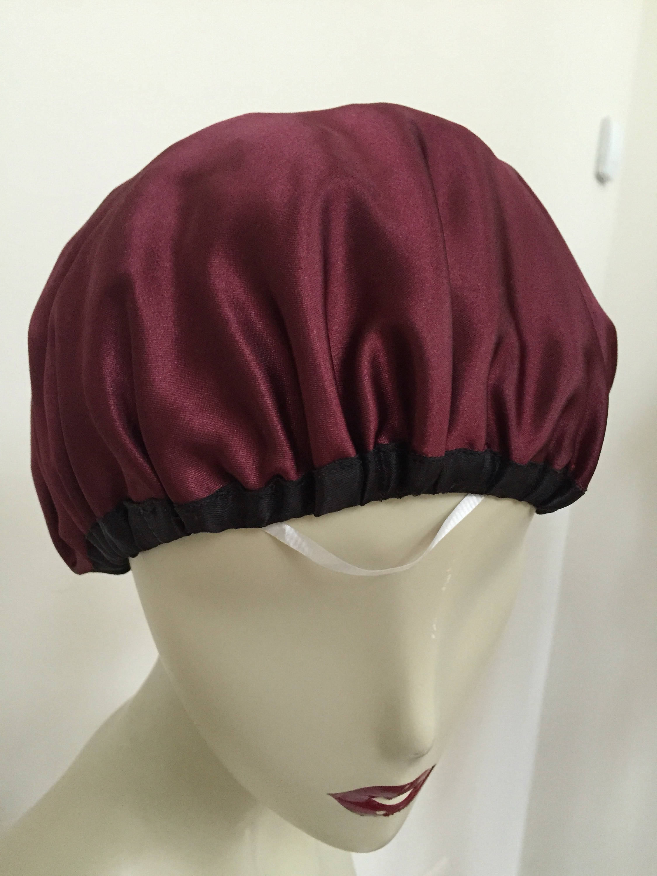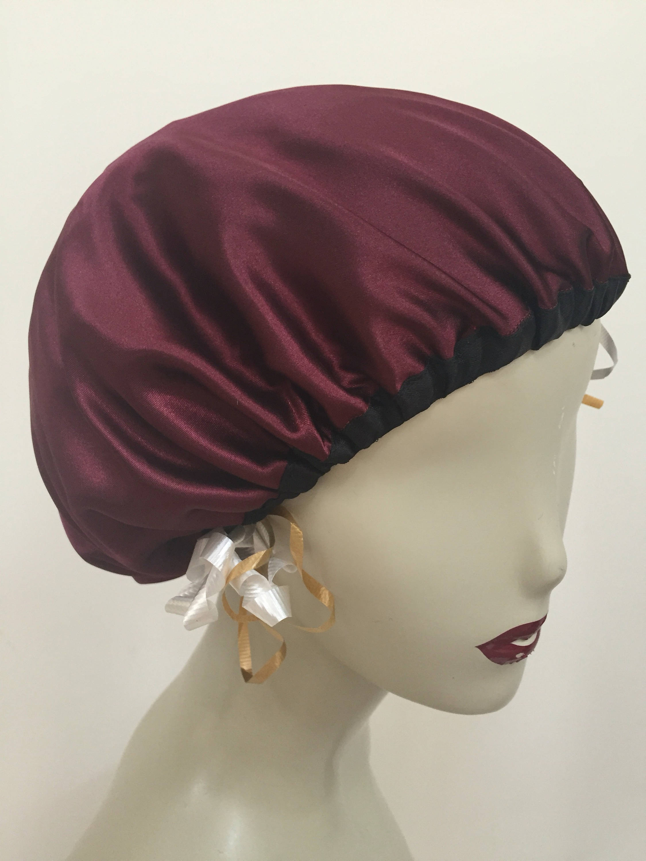 A luxurious dark red satin sleep cap with black satin trim. This soft night hat protects hair from household lint, dust and cooking scent. An affordable holiday gift for women. One standard size. Hand wash cold using mild soap, no bleach, rinse, and air dry.
