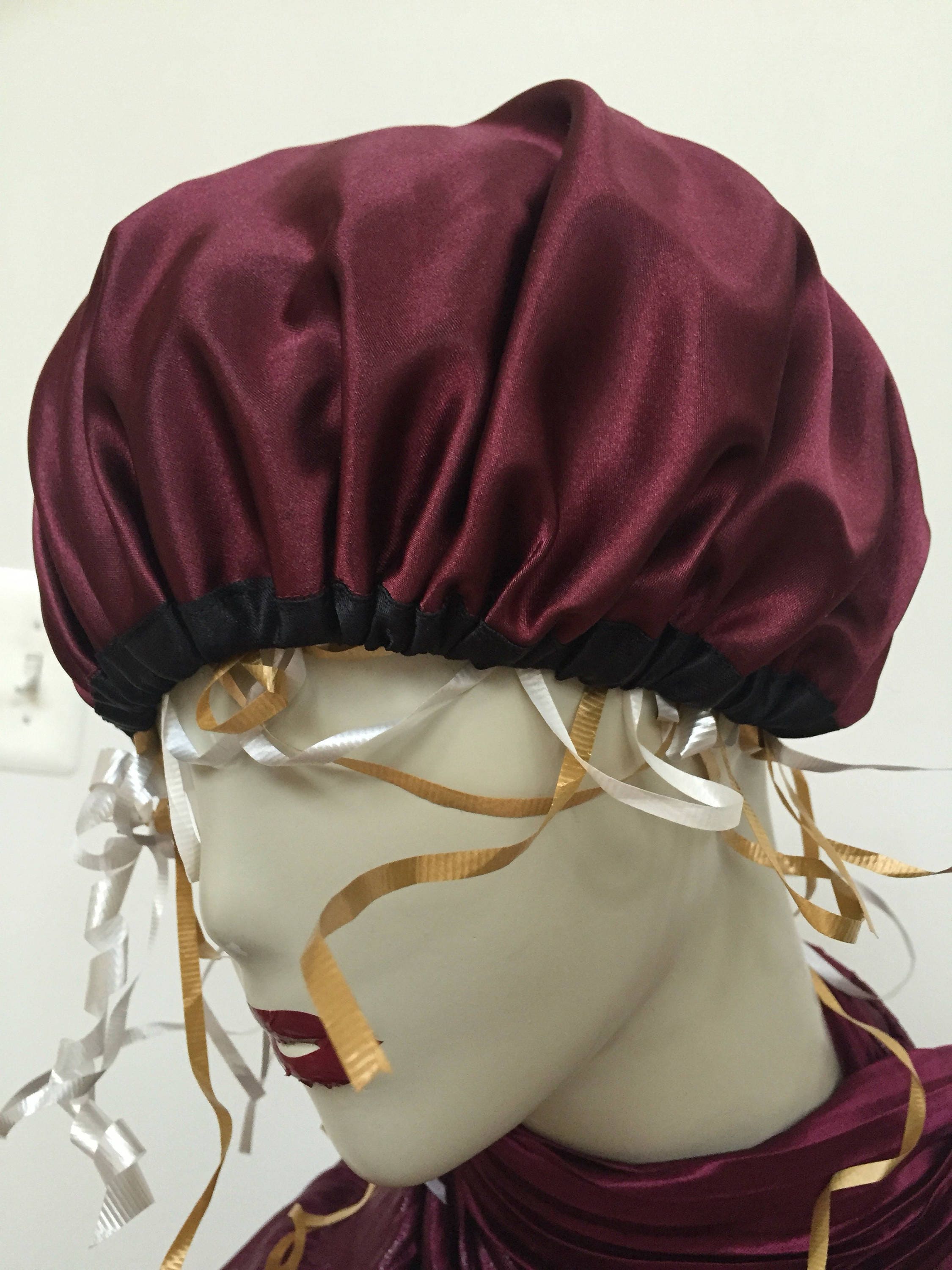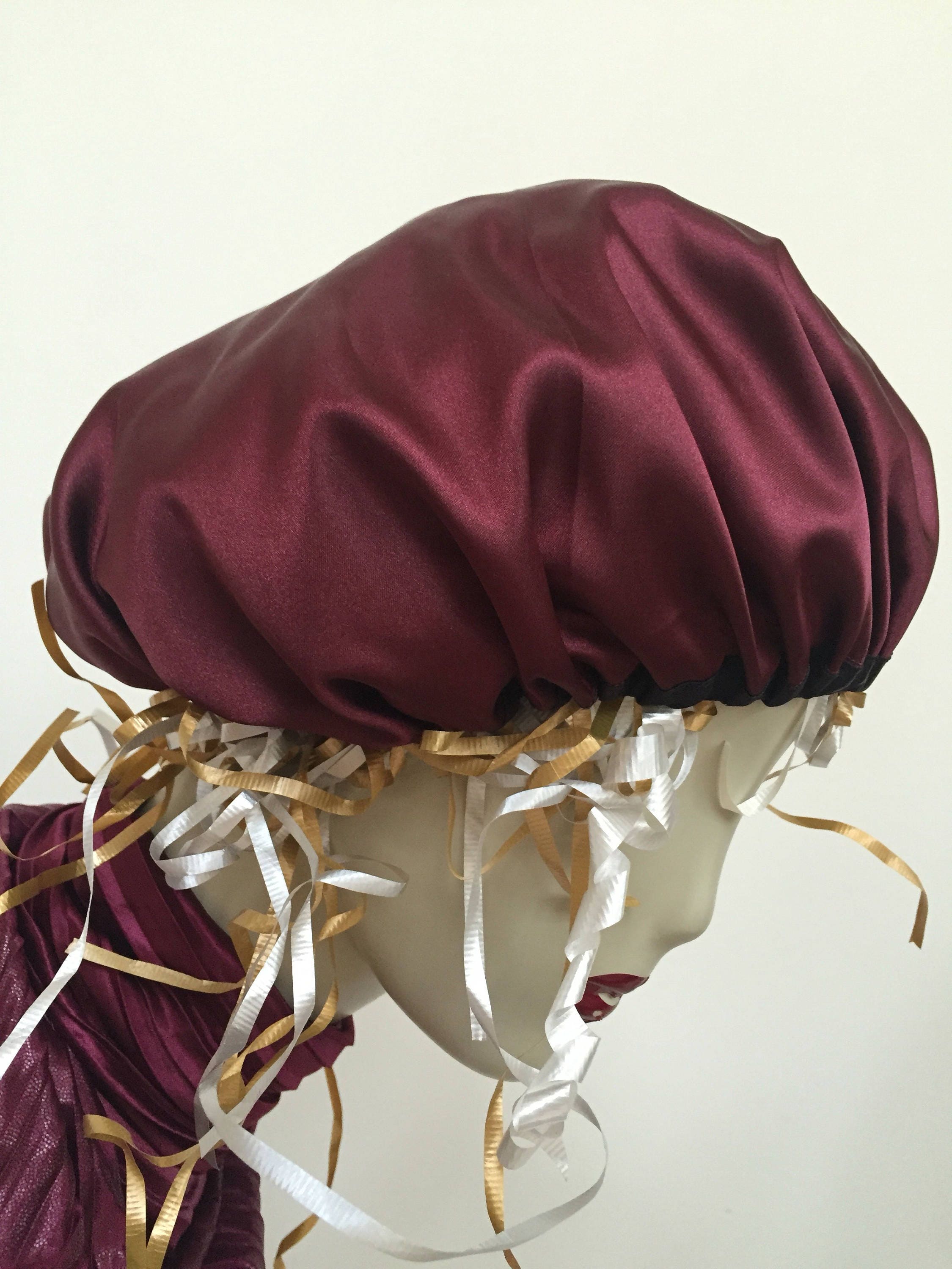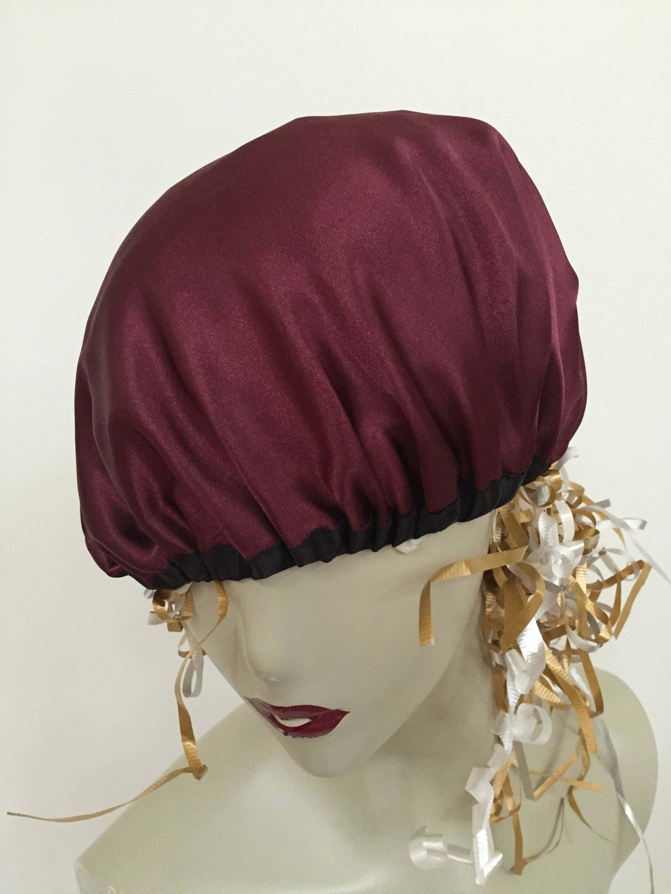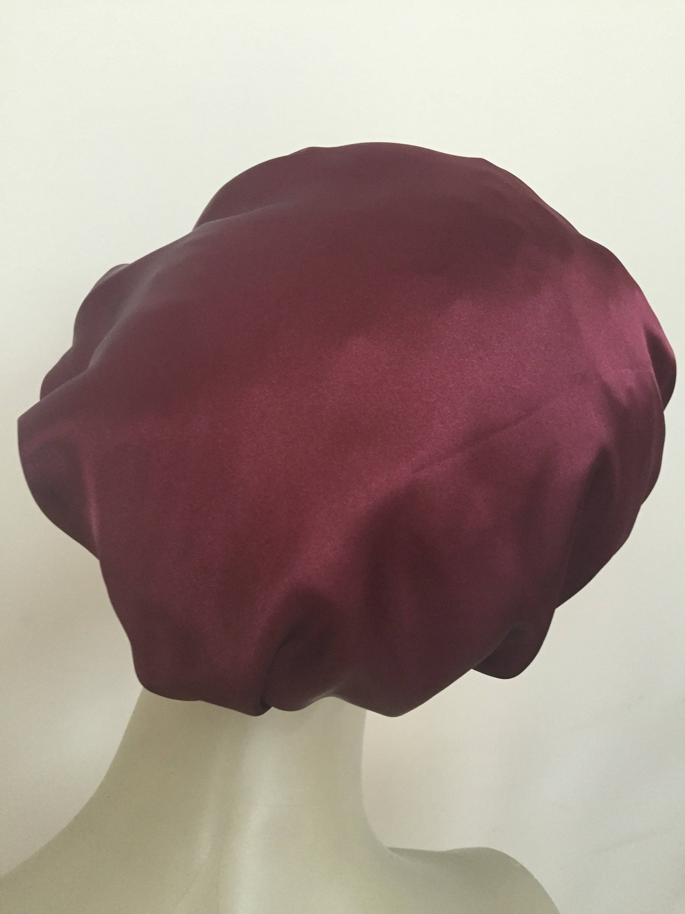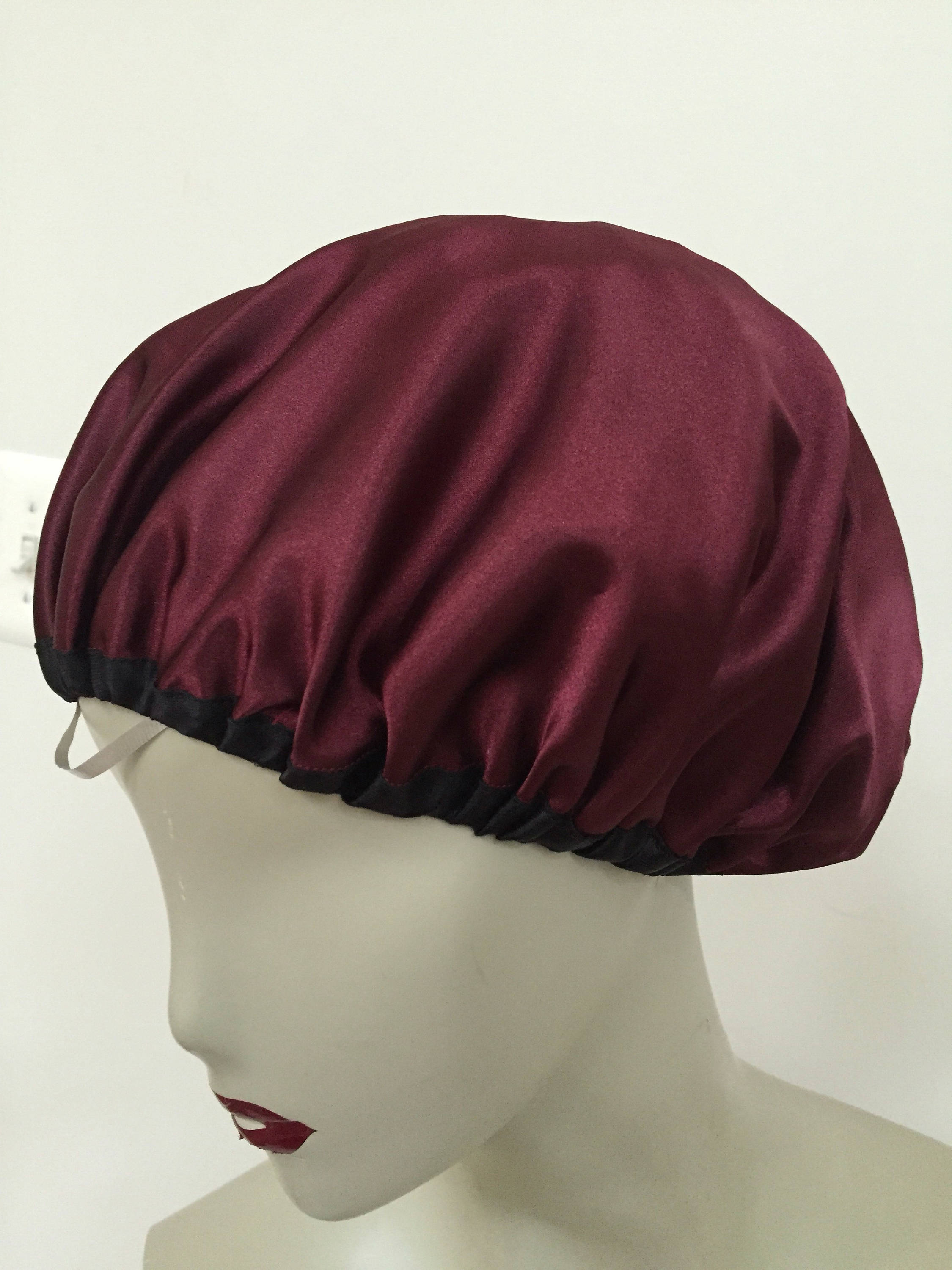 A luxurious dark red satin sleep cap with black satin trim. This soft night hat protects hair from household lint, dust and cooking scent. An affordable holiday gift for women. One standard size. Hand wash cold using mild soap, no bleach, rinse, and air dry.