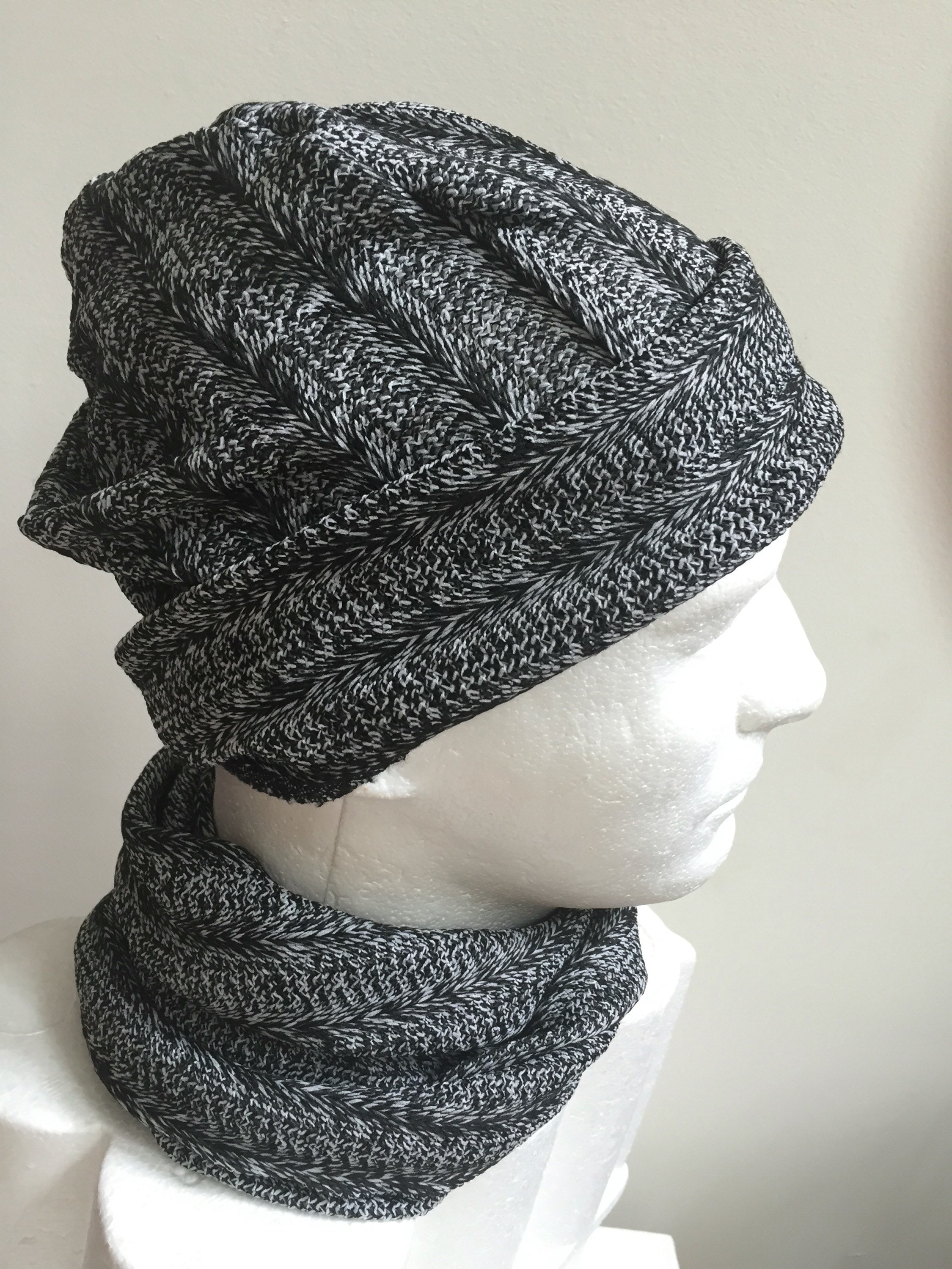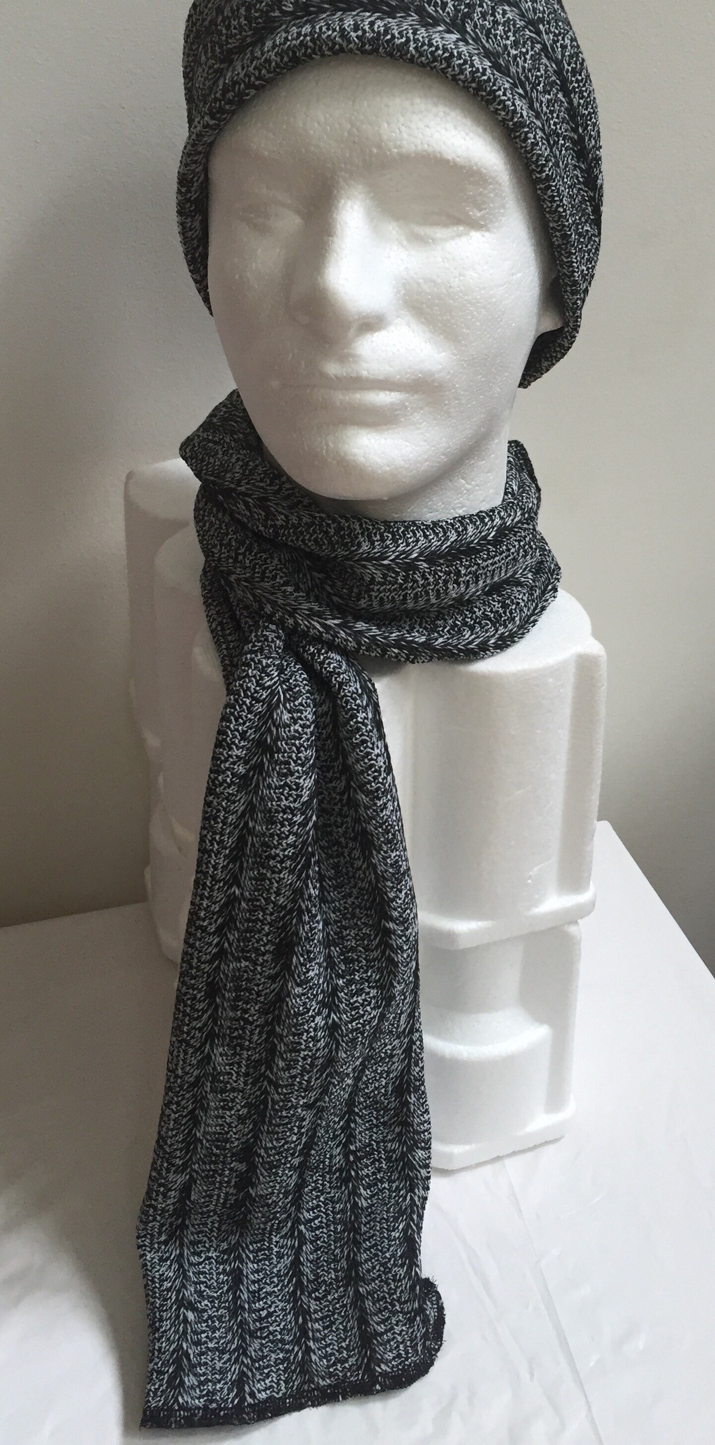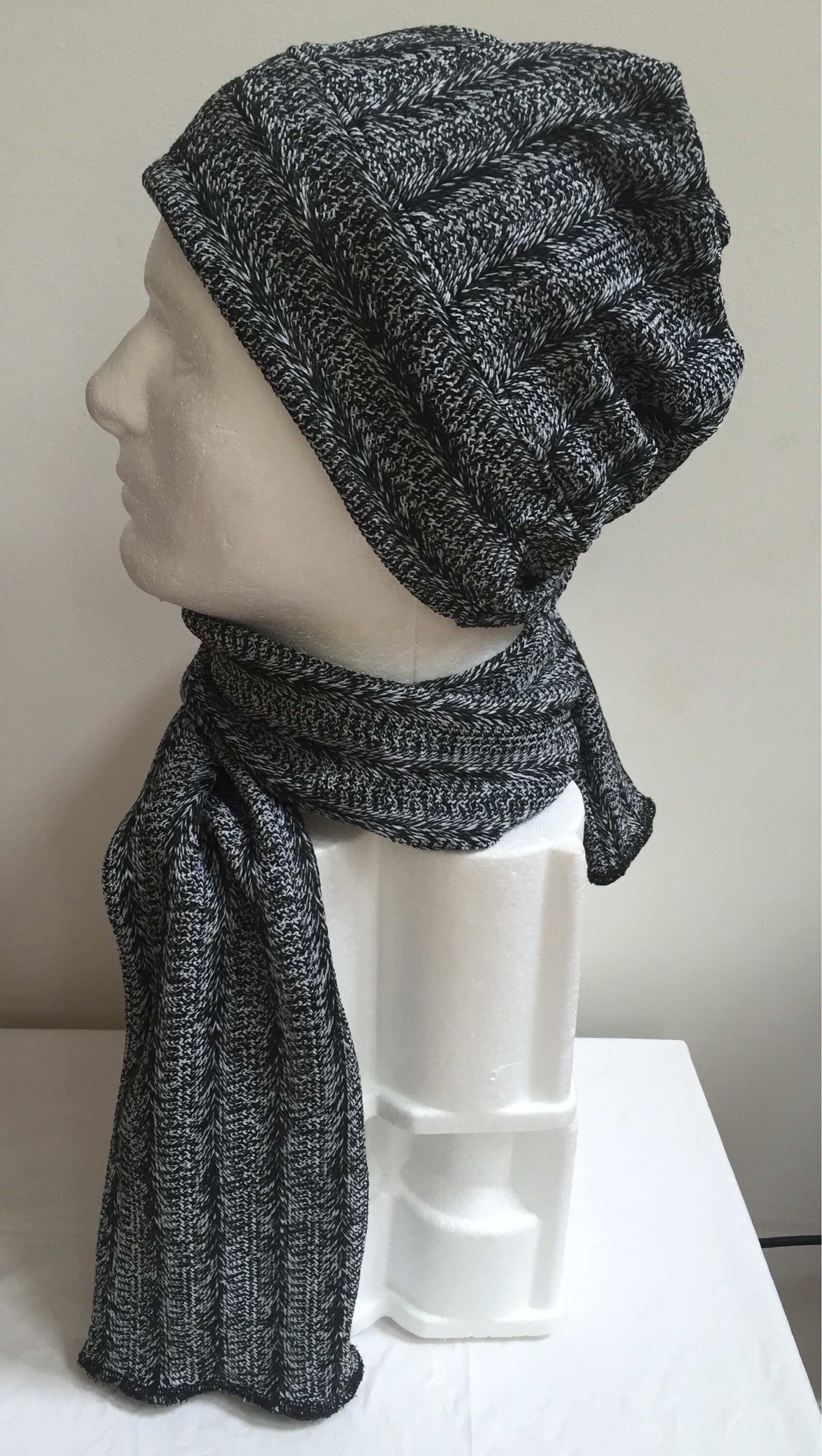 Men's black and white slouchy hat and scarf set. A warm and practical holiday gift for men. One standard size fits most. Material: soft acrylic stretch knit. Hand cut, machine sewn, hand finished.