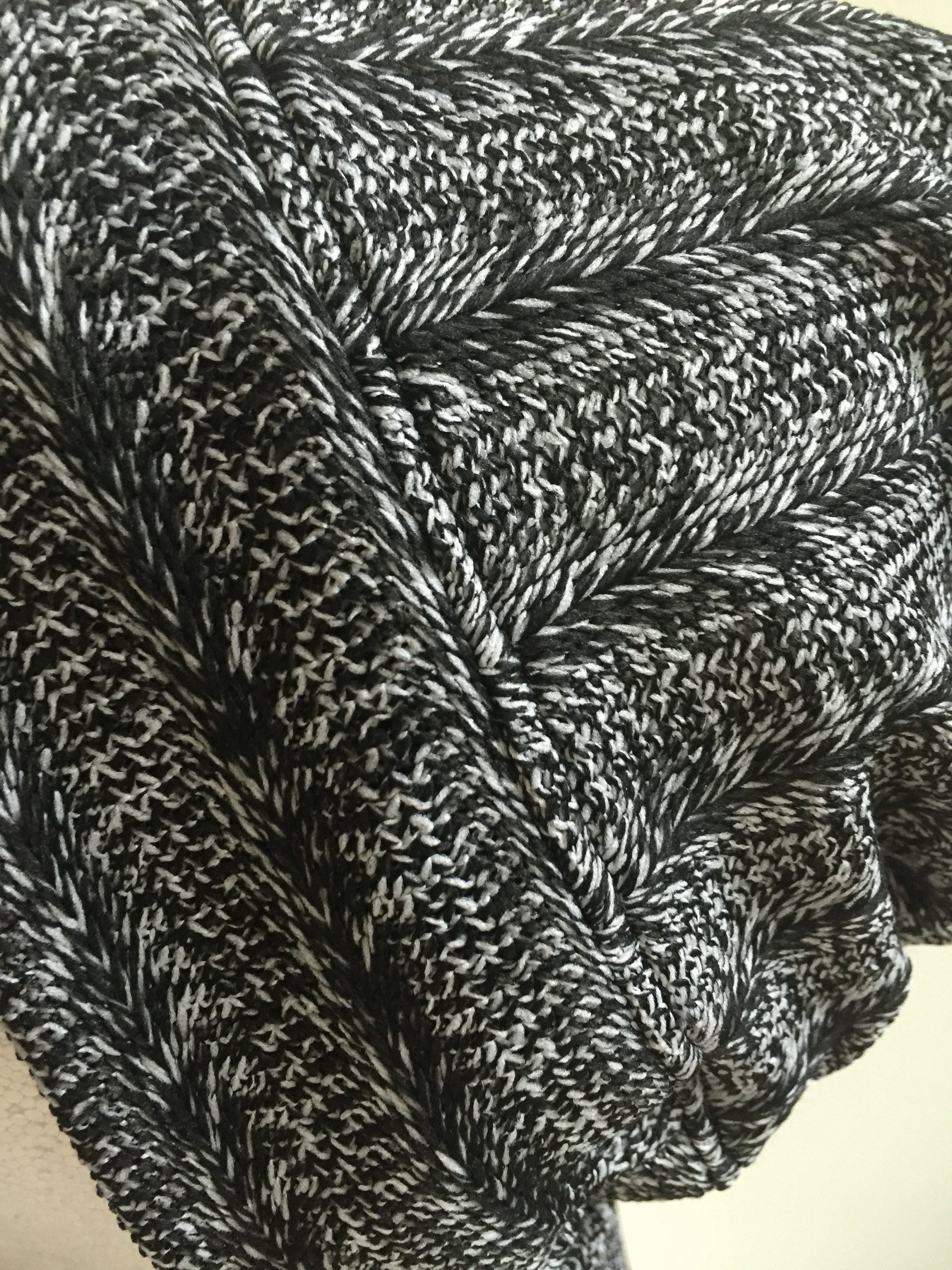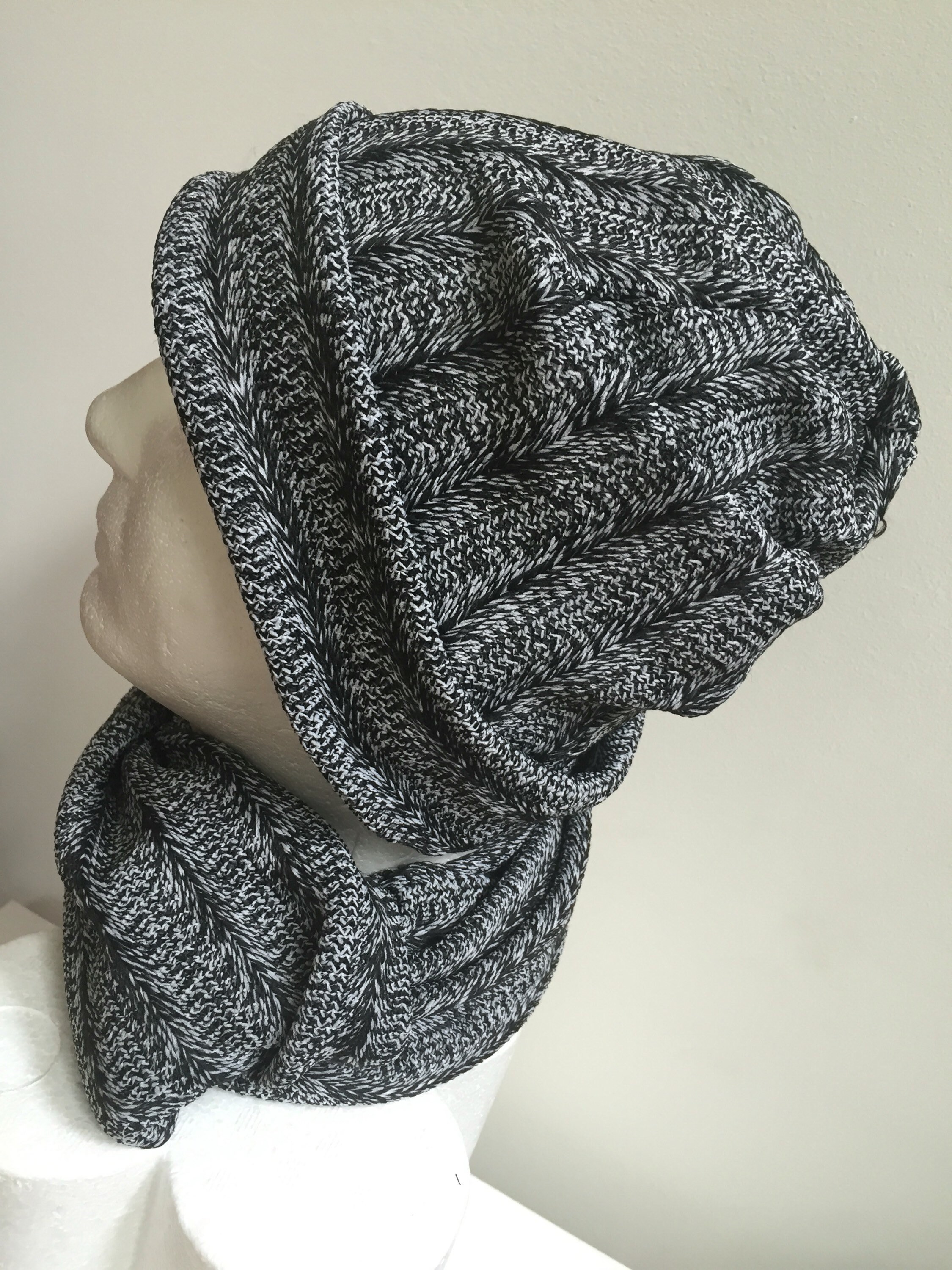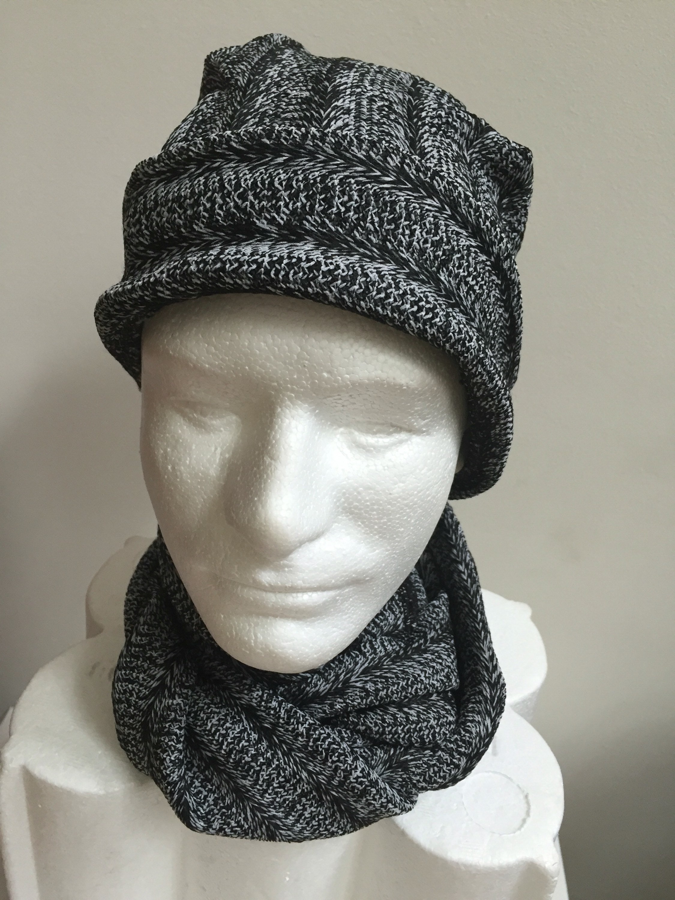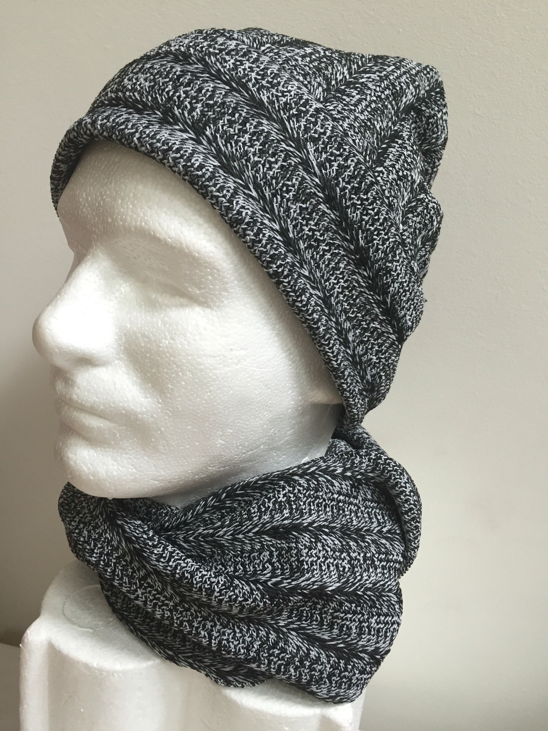 Men's black and white slouchy hat and scarf set. A warm and practical holiday gift for men. One standard size fits most. Material: soft acrylic stretch knit. Hand cut, machine sewn, hand finished.