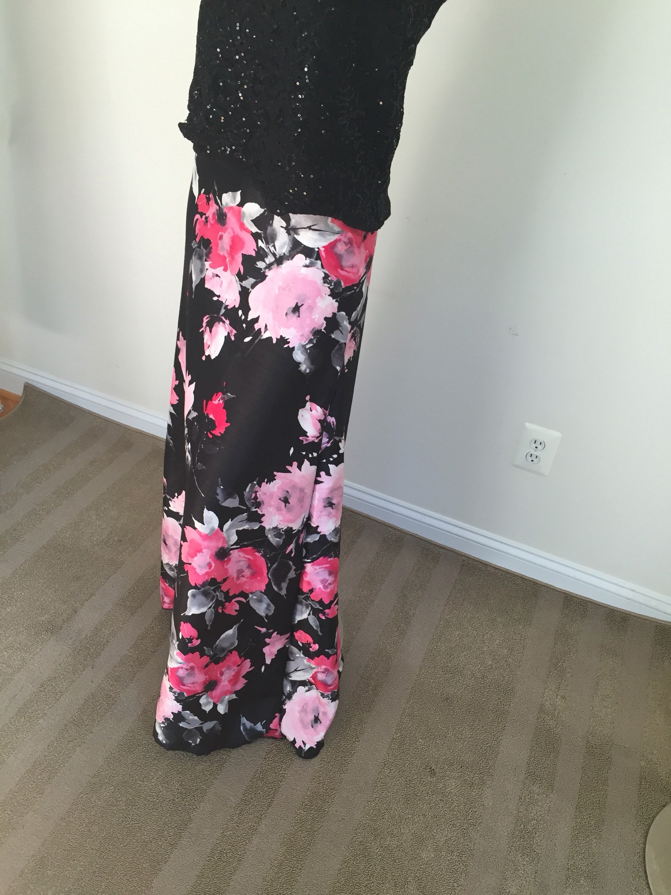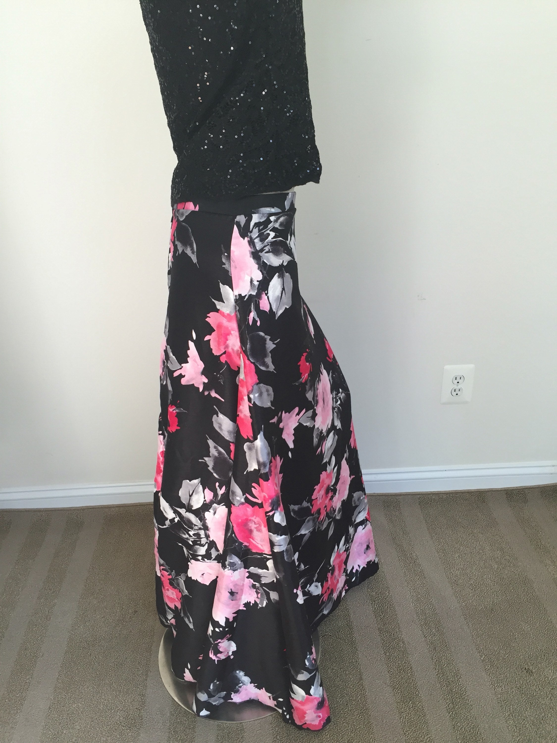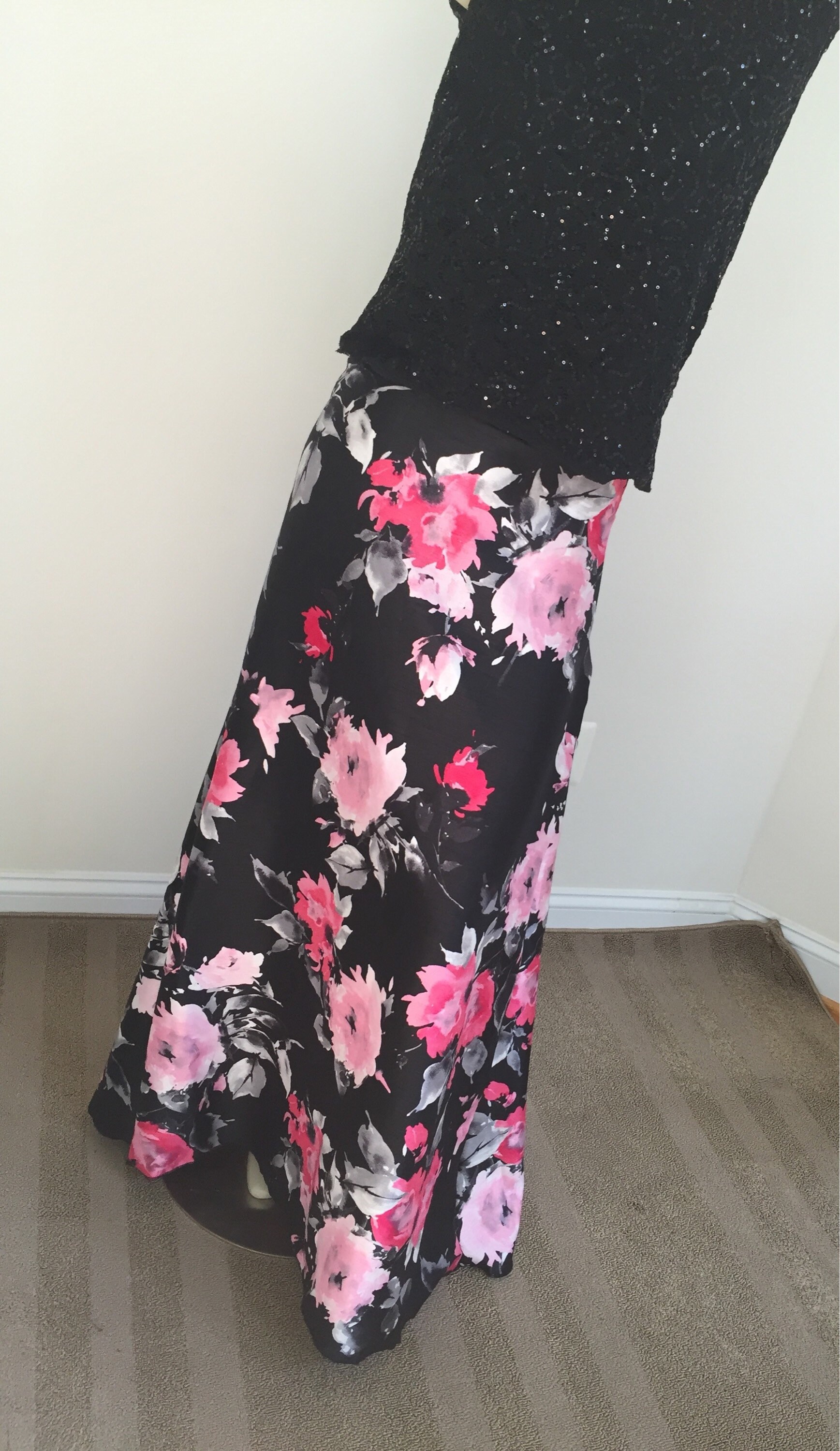 Black and pink multi floral maxi skirt for women. Rich Shantung poly fabric. Back zipper closure. women’s Size L. Waist, 32". Skirt length from center back waist to hem, 41". Model is 6 ft. tall. Hand wash warm or dry clean; air dry.