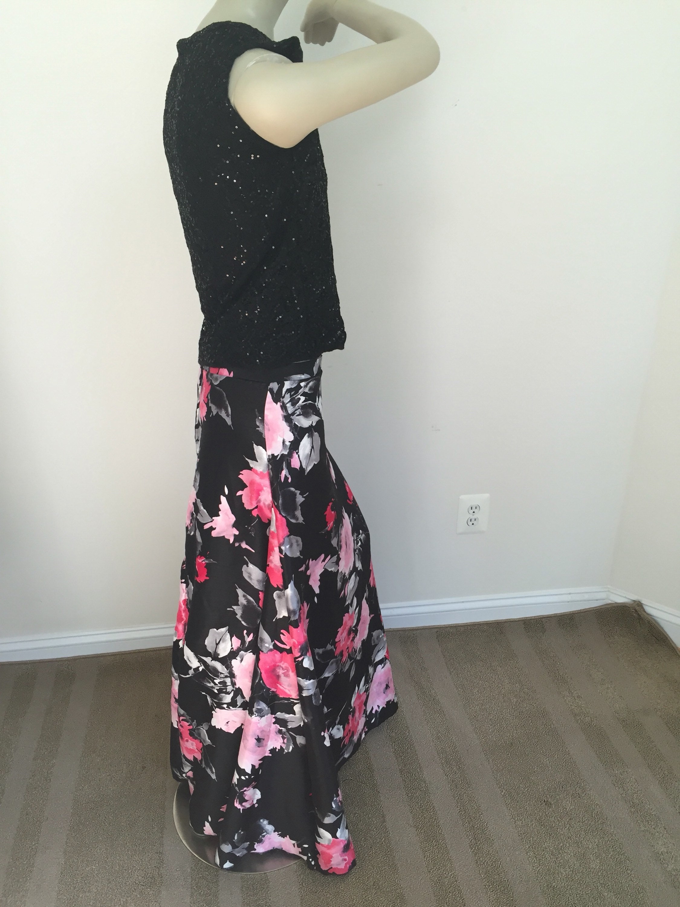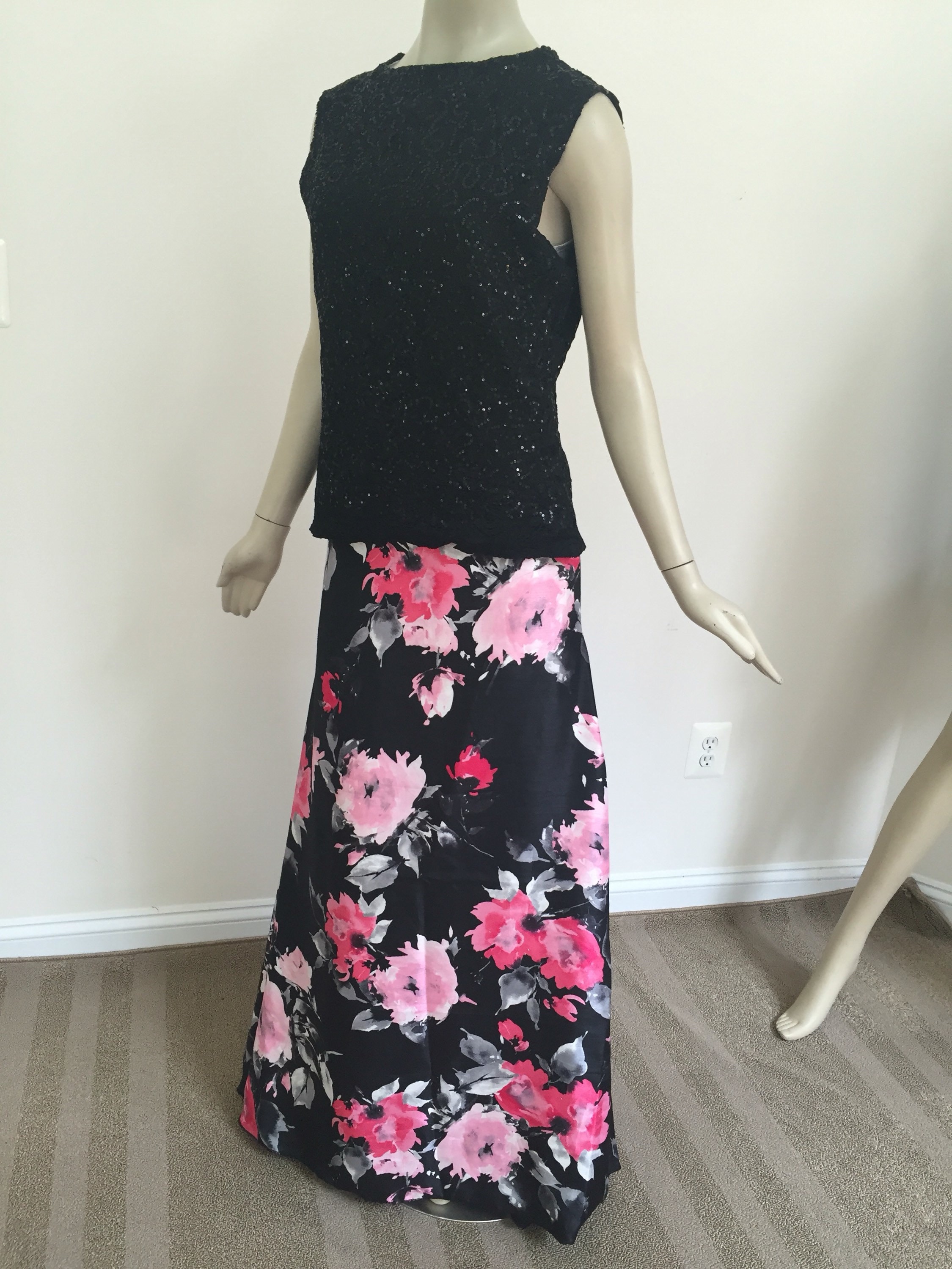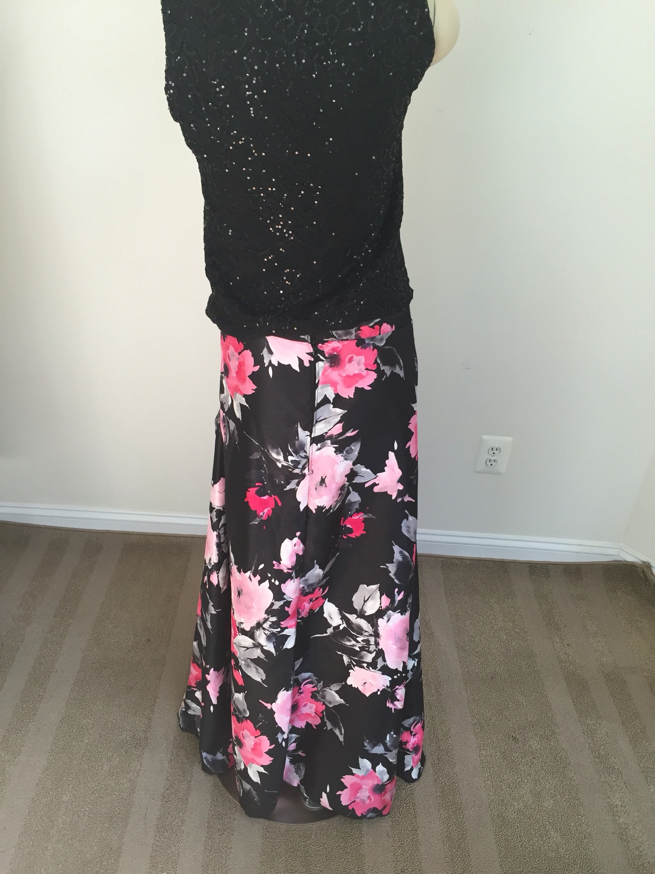 Black and pink multi floral maxi skirt for women. Rich Shantung poly fabric. Back zipper closure. women’s Size L. Waist, 32". Skirt length from center back waist to hem, 41". Model is 6 ft. tall. Hand wash warm or dry clean; air dry.