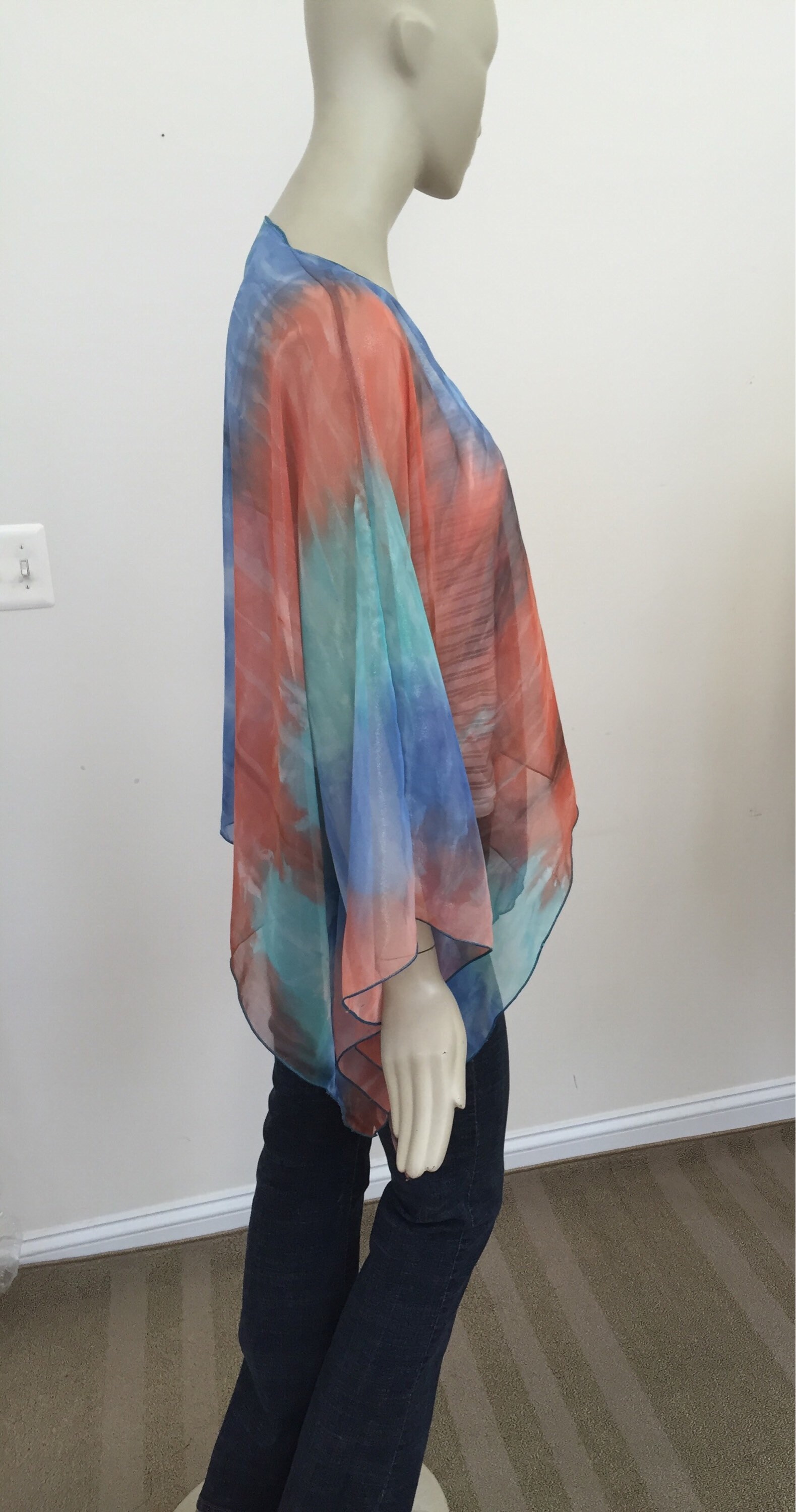 The sweet colors of water and sunset in boho tie-dye print. Iridescent sea blue and orange French chiffon casual kimono wrap. Sheer and shimmery. Pair with jeans or throw over a bathing suit on the beach. For casual indoor and outdoor wear in spring and summer. Lightweight see-through fabric is easy to pack, unpack, and throw on as a stylish layering piece. One size, designed to fit women anywhere from sizes S, M, L. 24" long.