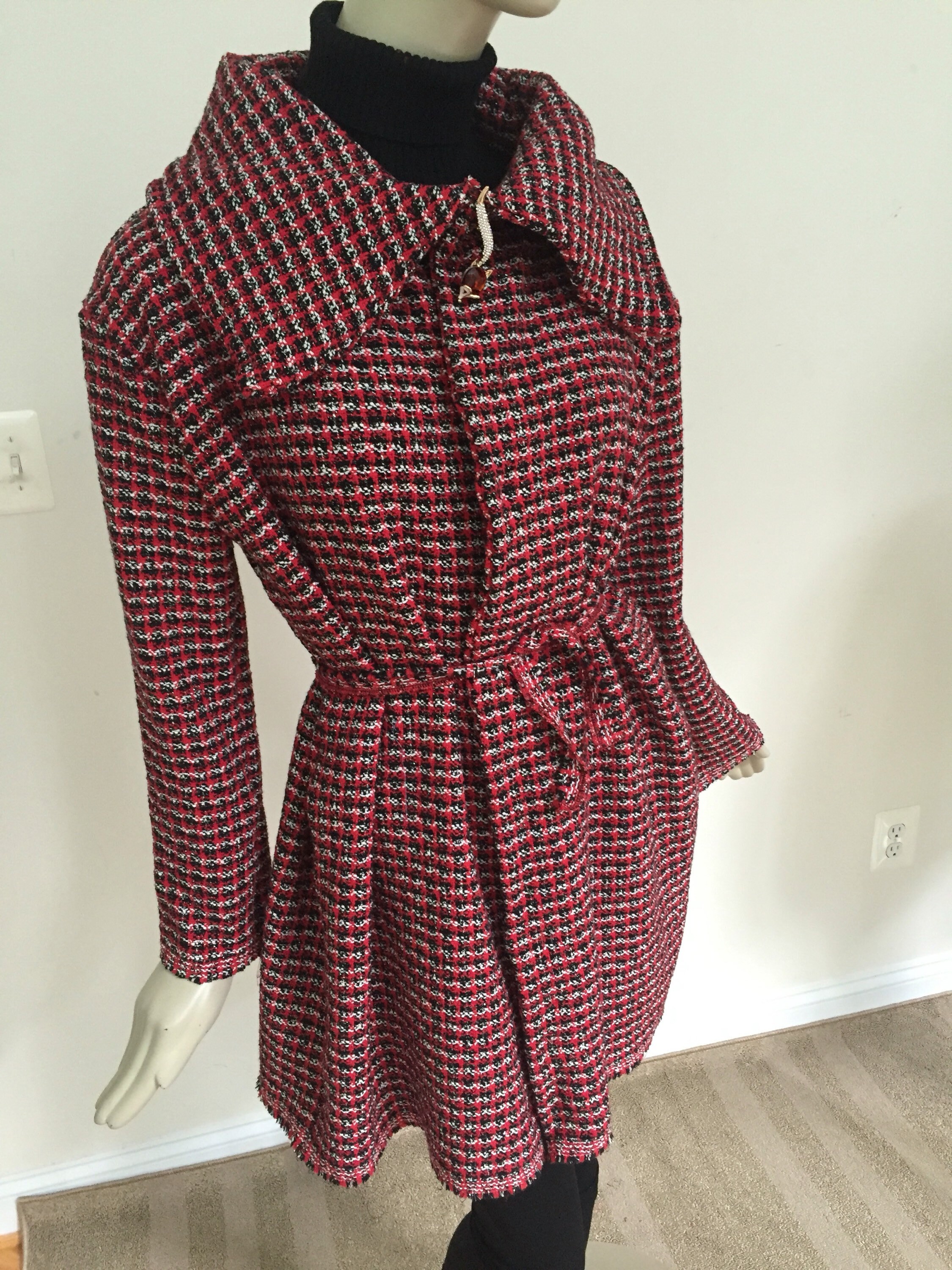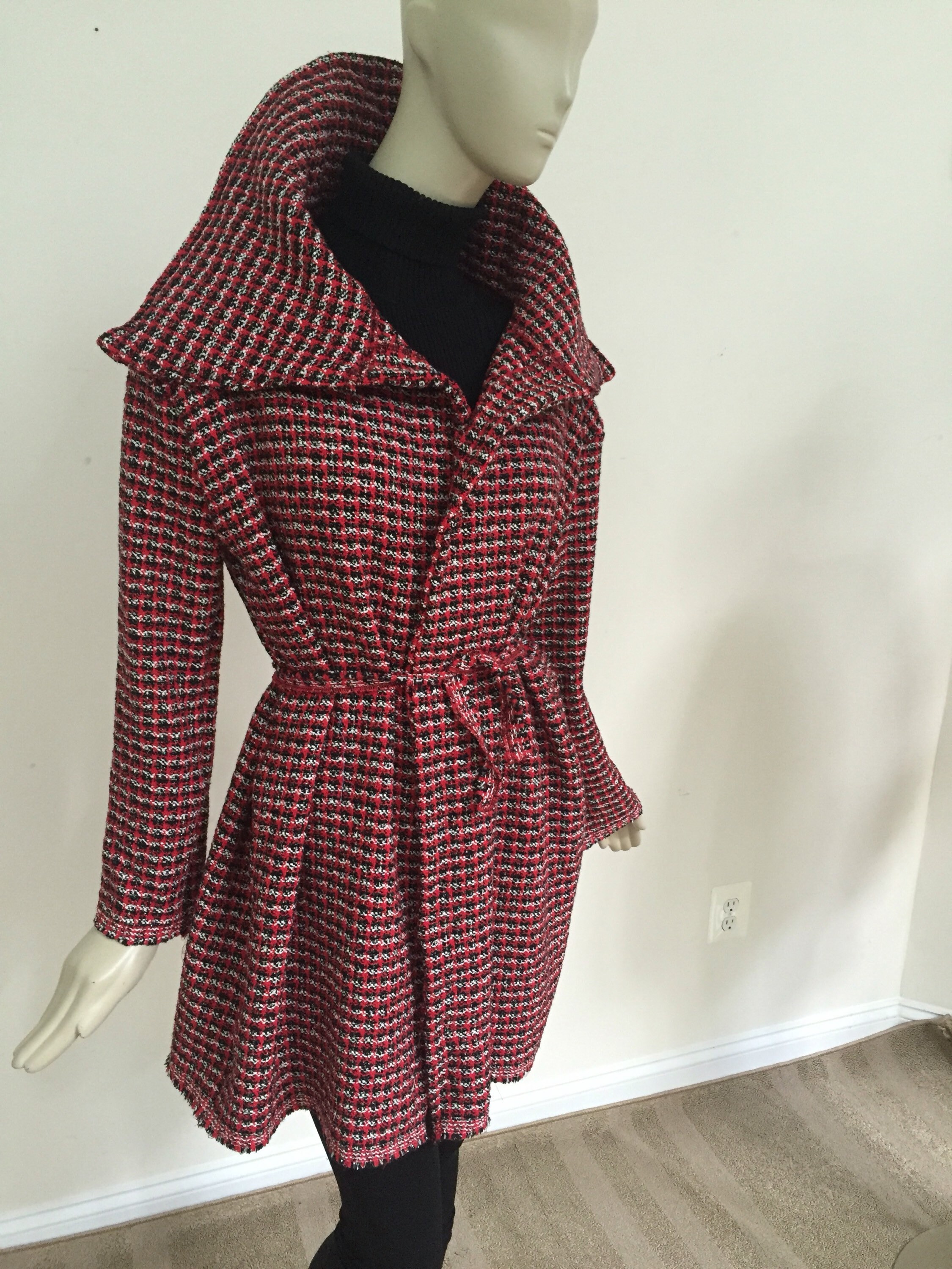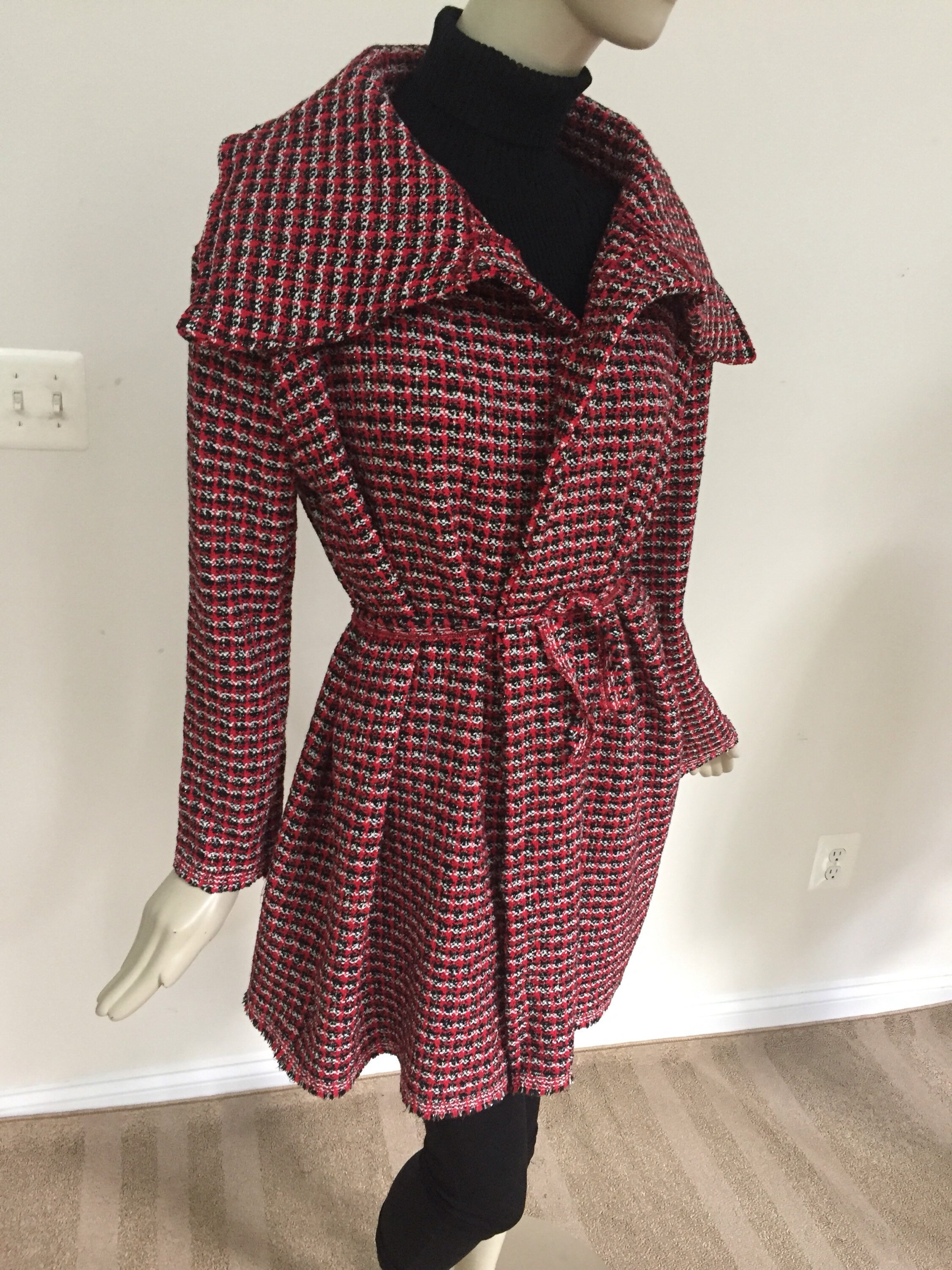 Elegant red dress coat. Shawl collar for warmth in mild weather.