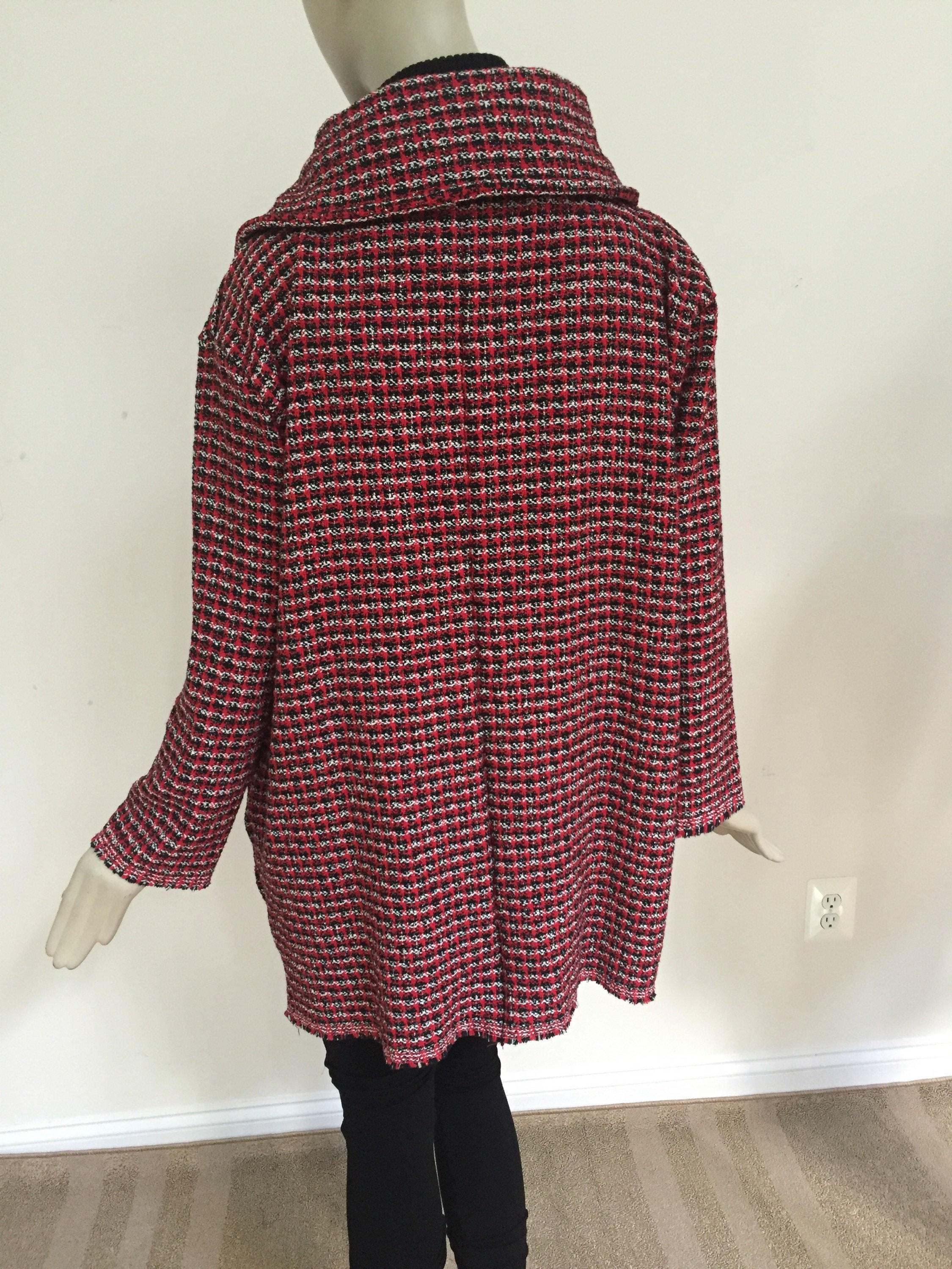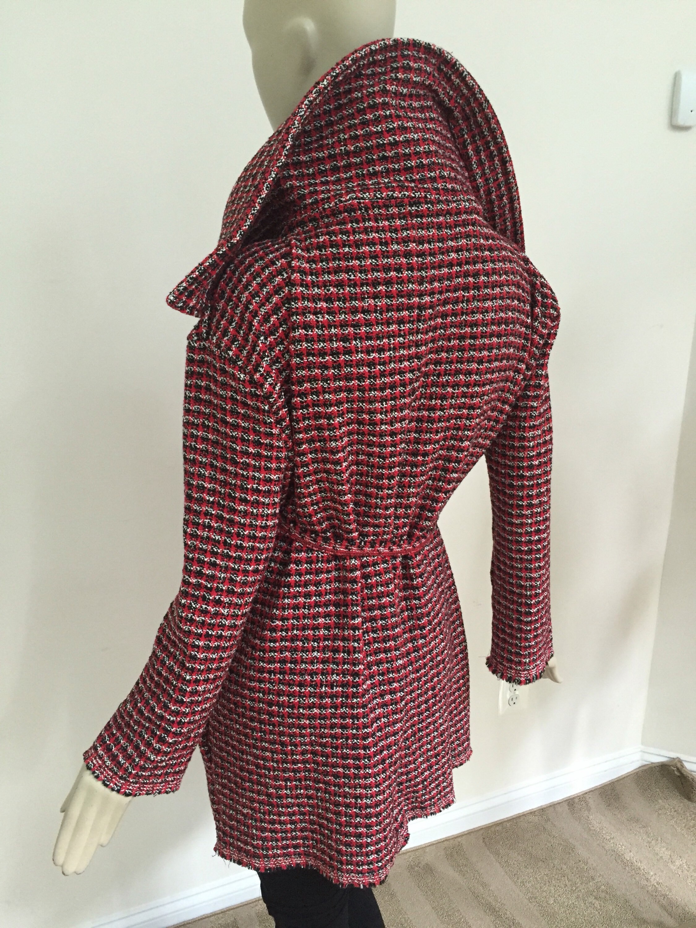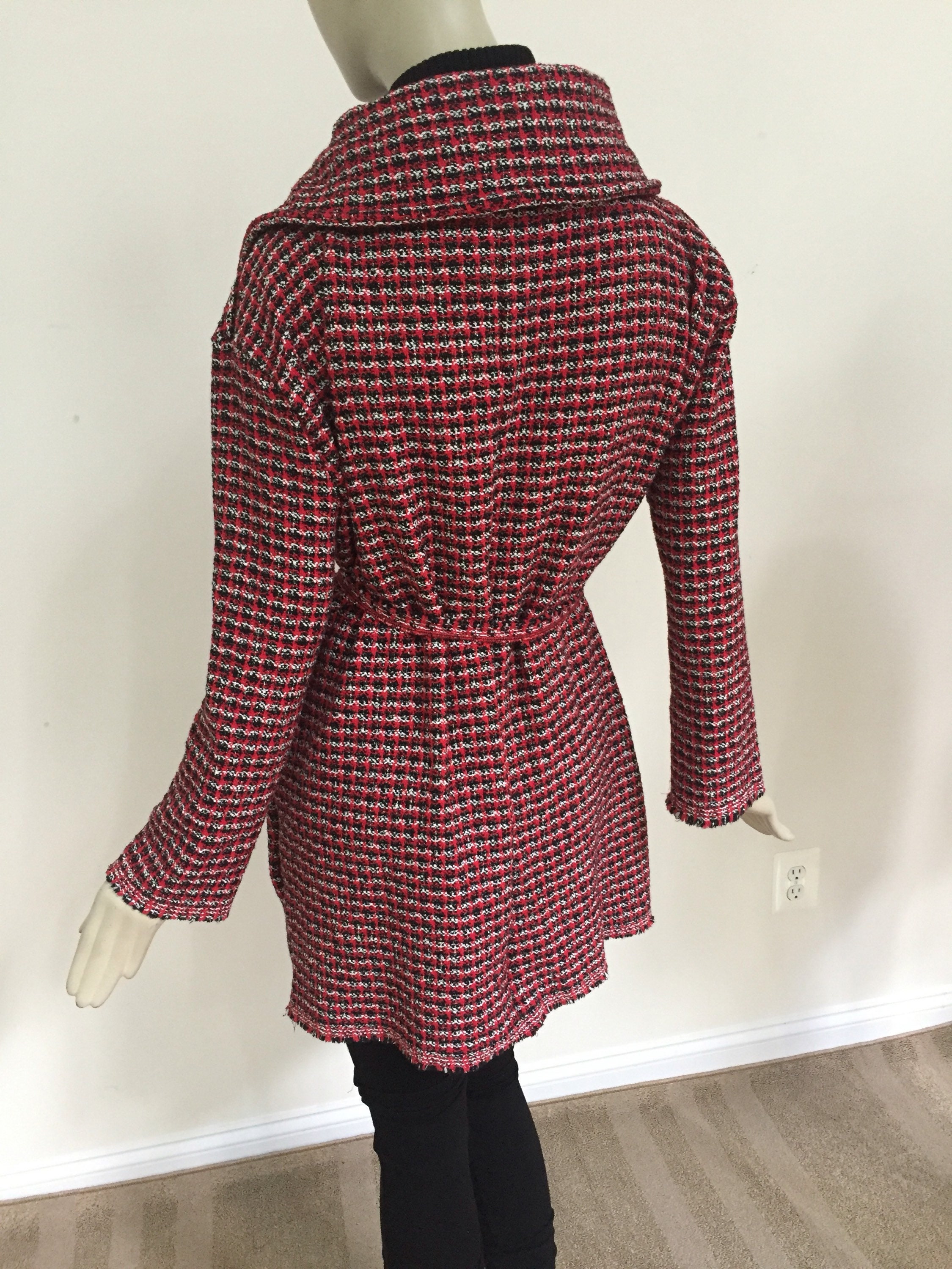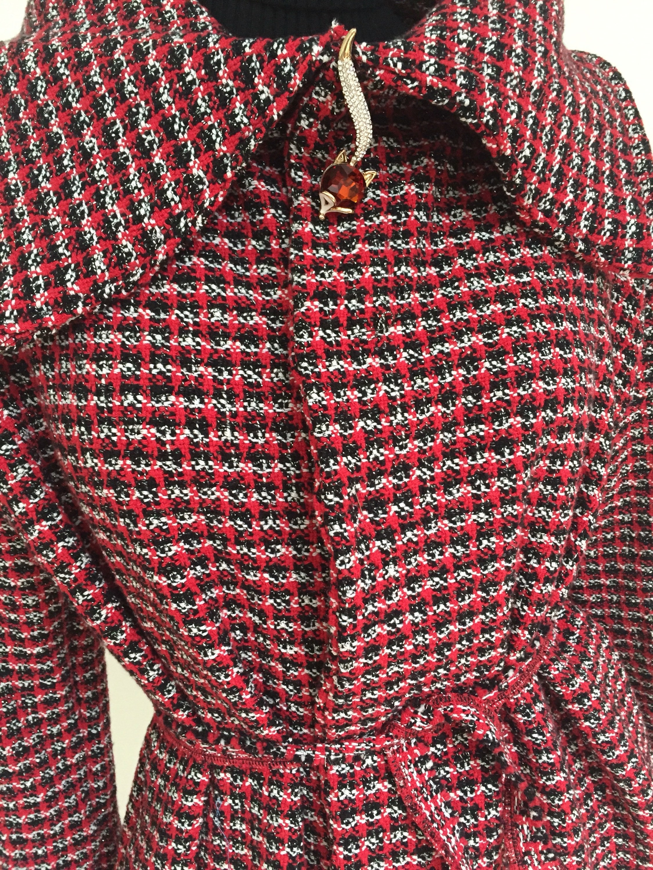 Elegant red dress coat. Shawl collar for warmth in mild weather.