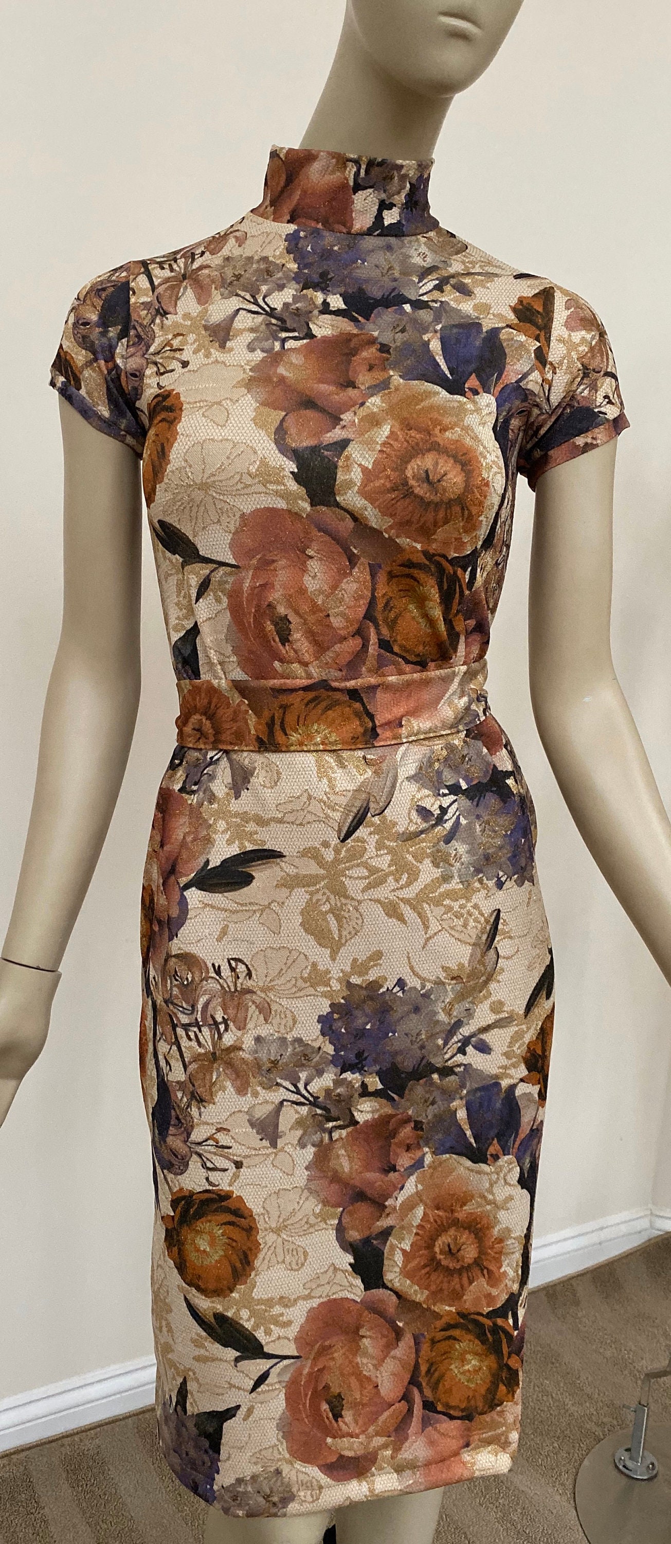 An elegant floral turtleneck dress with subtle sparkle for special day and evening occasions. Cap sleeves. Rear zipper closure with hook and eye.