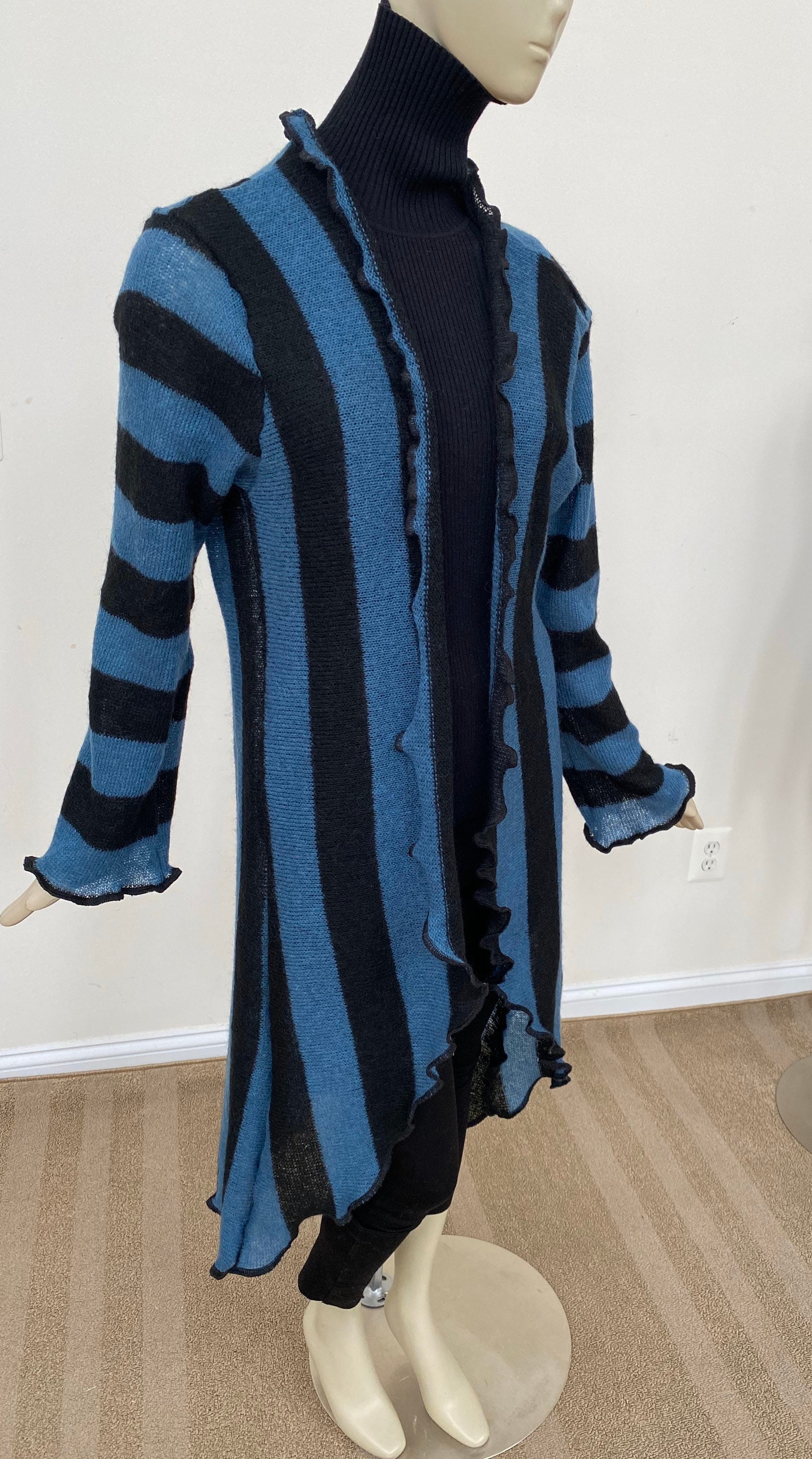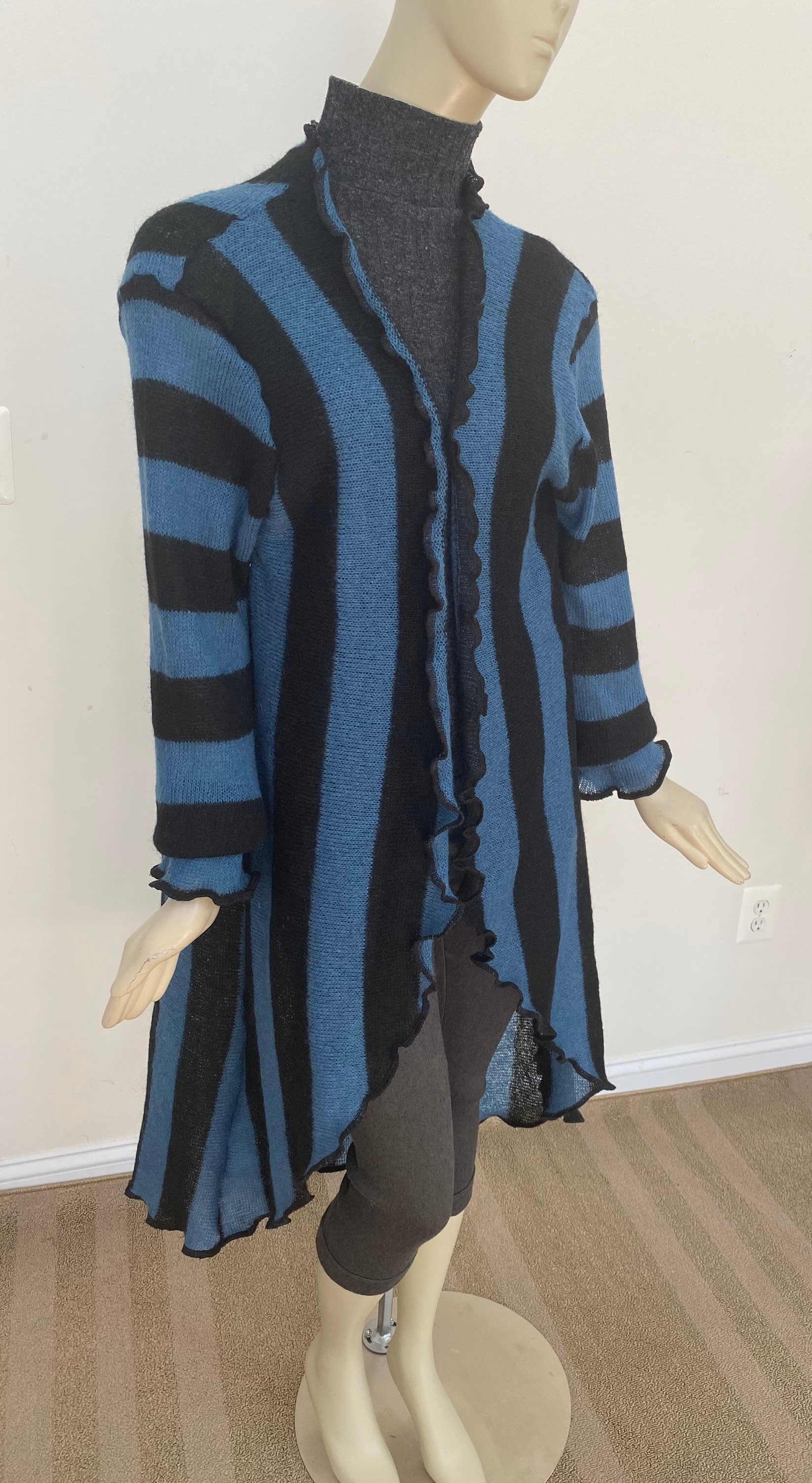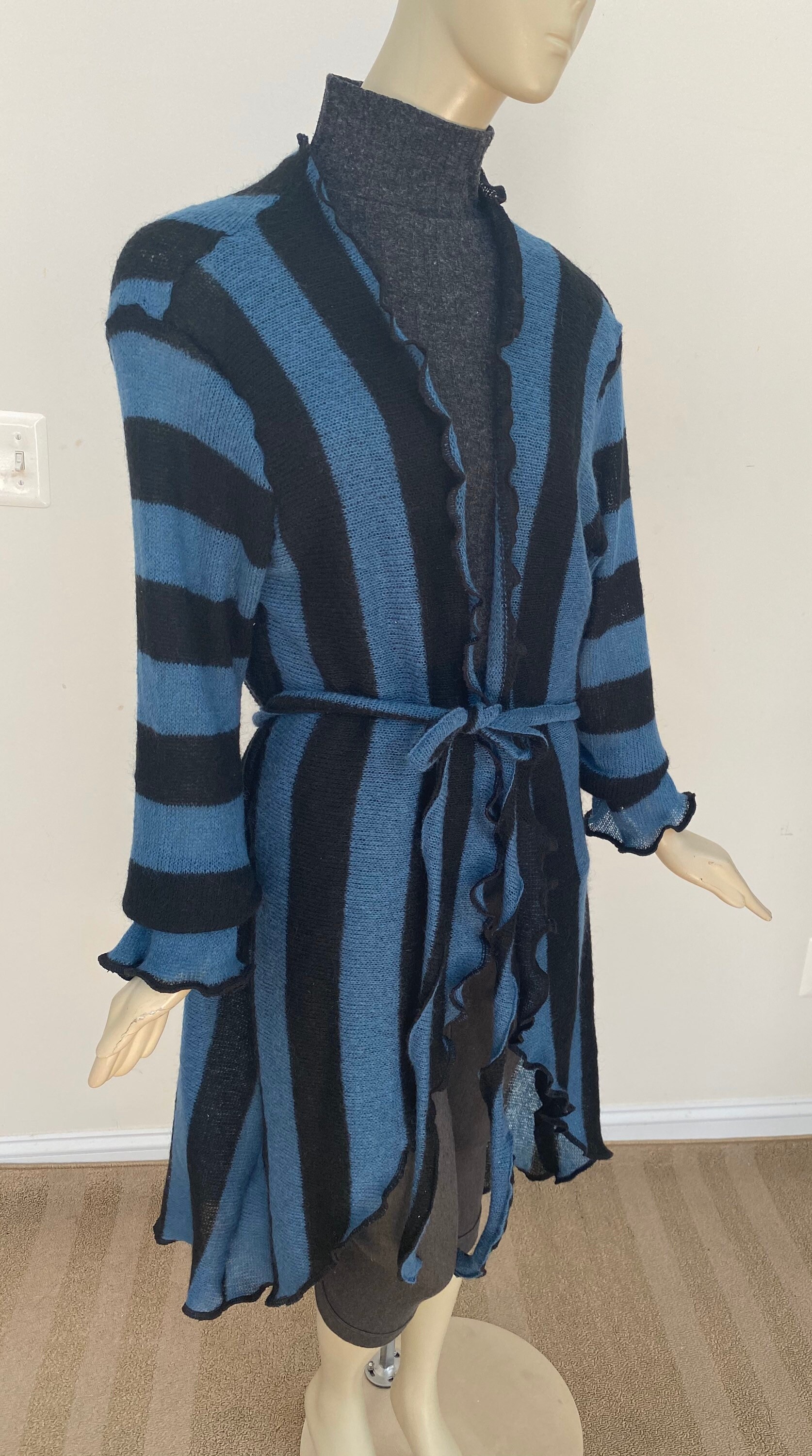 Bold vertical stripe cardigan. Blue and black acrylic jacket. Long sleeves, flared asymmetrical hem. Open front style with belt for a cinched waist. Lightweight knit is easy to pack or hand carry wherever you go. A versatile layering piece for spring and summer. Approx 45” long from center back neck to hem. One size. Designed to fit women US women size M-L (6-10). Gentle machine wash, air dry.