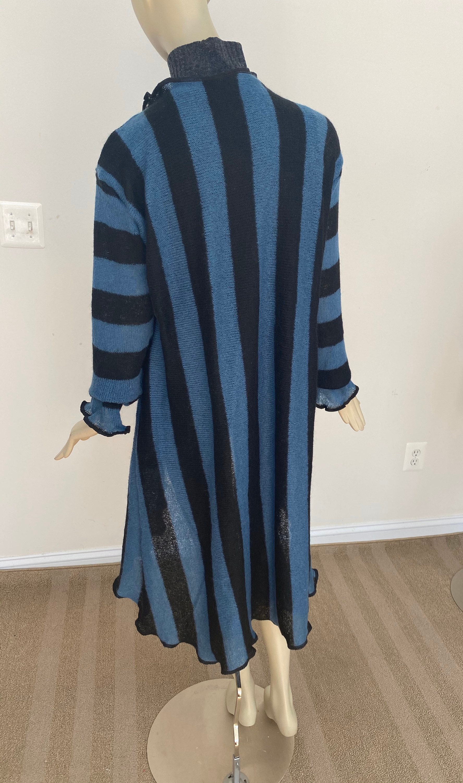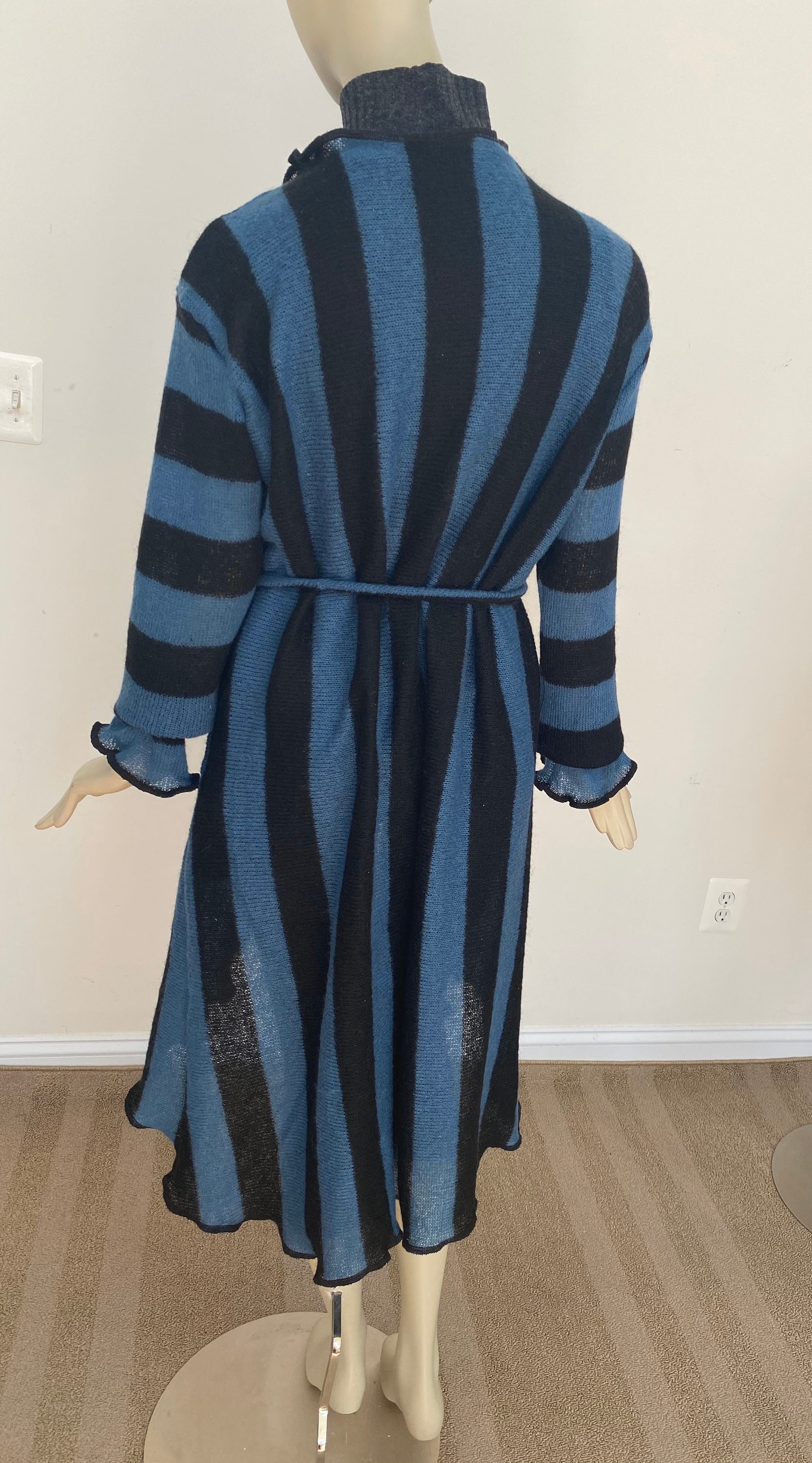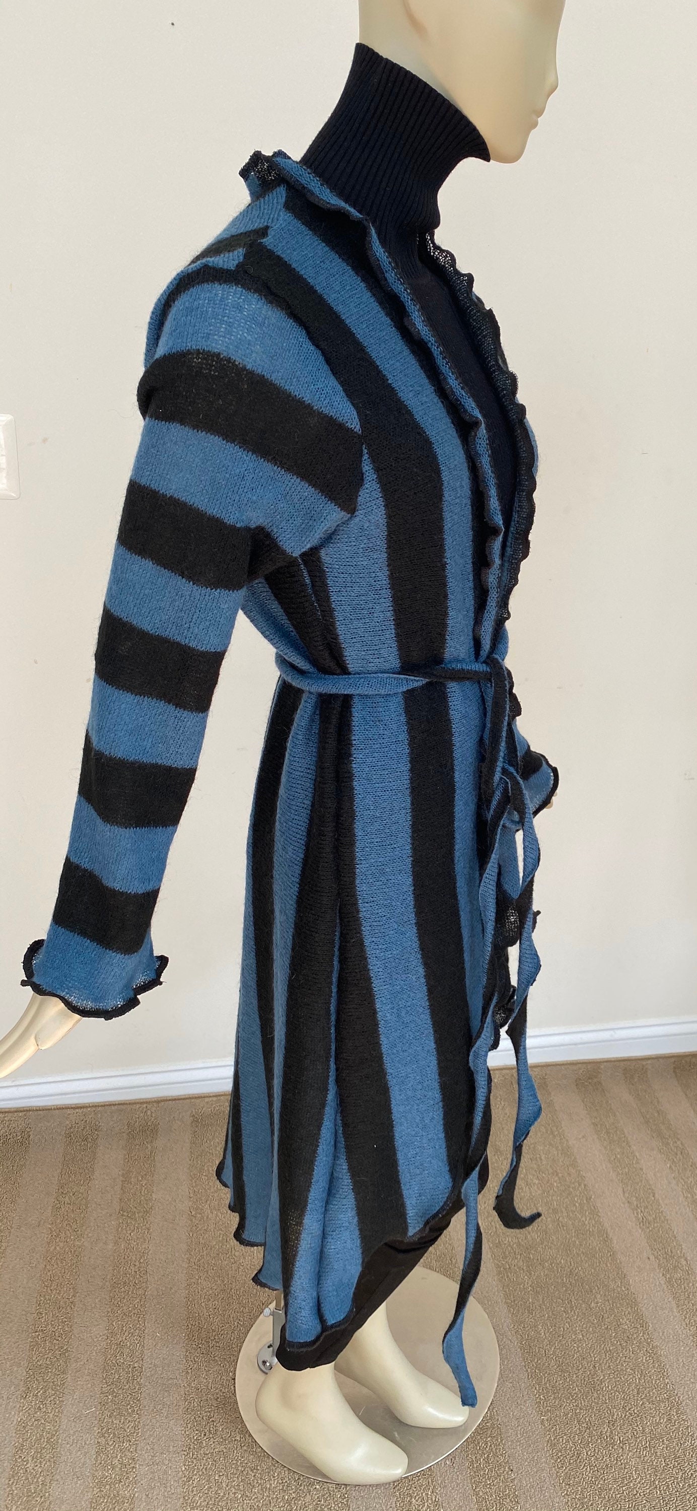 Bold vertical stripe cardigan. Blue and black acrylic jacket. Long sleeves, flared asymmetrical hem. Open front style with belt for a cinched waist. Lightweight knit is easy to pack or hand carry wherever you go. A versatile layering piece for spring and summer. Approx 45” long from center back neck to hem. One size. Designed to fit women US women size M-L (6-10). Gentle machine wash, air dry.