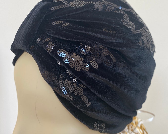 Woman's Velvet Jacquard Turban Hat. Black Floral Stretch Velvet Turban. Soft and Elegant. Elegant Headwear, Wear With or Without Hair.